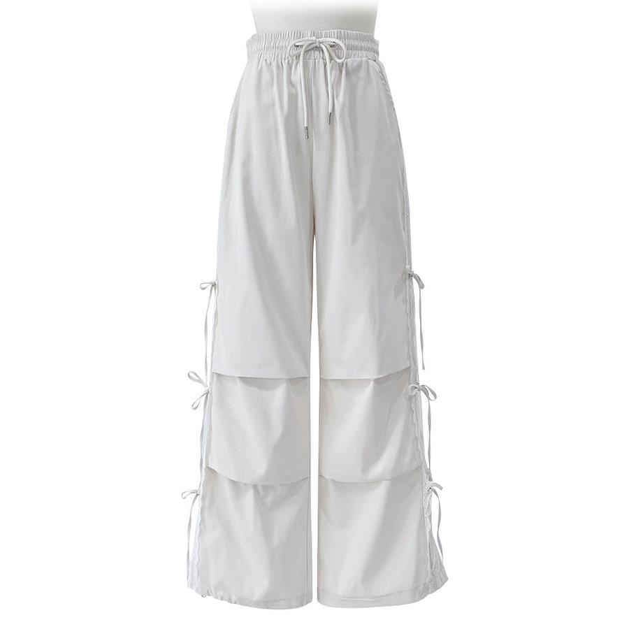 サイドに施された2本ラインやレーステープ、リボンがカジュアル過ぎずガーリーな印象を与えるカーゴパンツ。