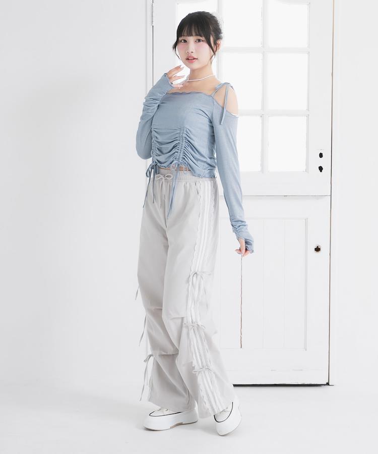 クロップド丈やオフショルのカットソーとの相性が抜群で、カジュアルでありながらガーリーな要素も加わりどんなスタイルにもピッタリ。