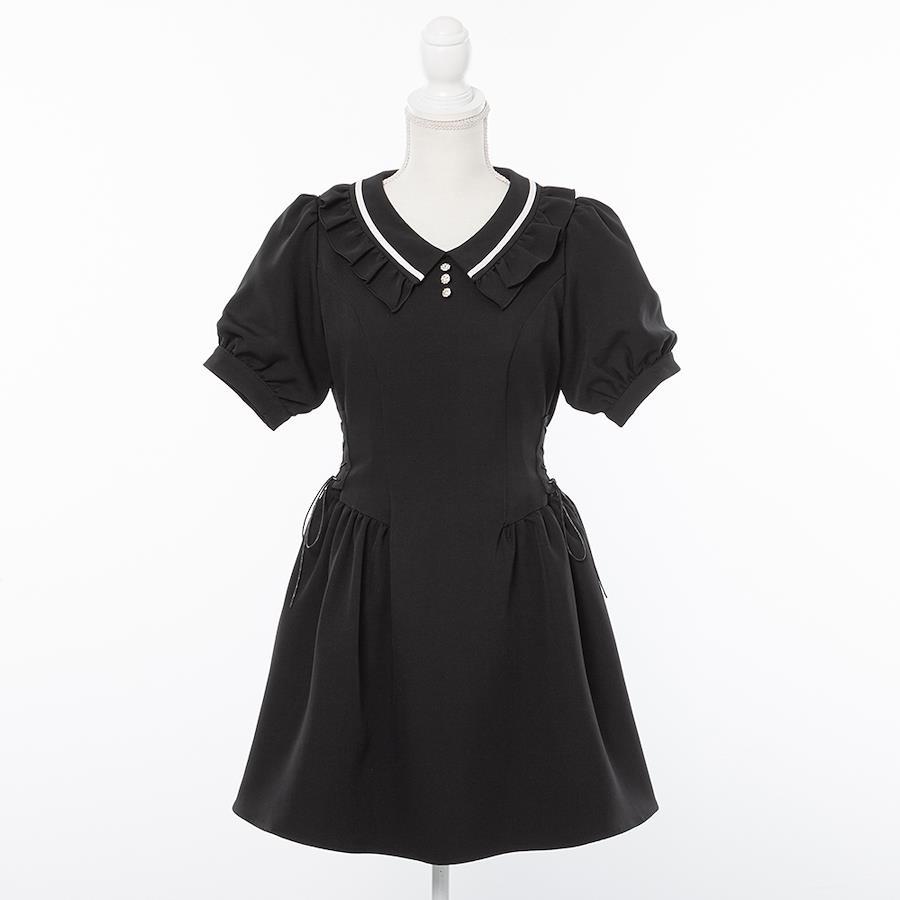 シンプルながらもデザイン性たっぷりなワンピースです!【デザイン】ブロケットコアライクなトレンドデザインのワンピースです。サイドレースアップにスカートのギャザー位置を低くすることで、コルセット感のあるデザインになりスタイルUP効果を狙いました!サイドレースアップの紐はご自身で結んでいただく仕様です。襟のラインがアクセントになっており、スポーツライクっぽさやプレッピーな印象をプラスしてくれます。角襟にフリルの甘めディテールを入れた事でカジュアルになりすぎず、甘くも辛くもコーデできるように拘りました!後ろファスナーを開閉して着脱する仕様になっており、ヘアメイクをした後でも着て頂きやすいのがポイントです。