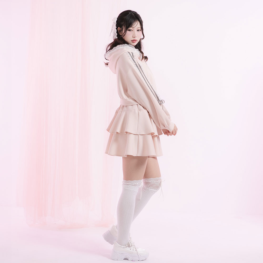 トレンド感たっぷりなスポーティー&ガーリーなスウェット風セットアップが登場!【デザイン】一着でスタイリングが完成し、それぞれセパレートでも活躍するセットアップ♪パーカーはお袖にふりふりのレースとベロアシルバーのラインテープを施し、どこから見ても映えるデザインに♪フードの口にもフリルテープを施したので、後ろ姿も抜かりなく可愛く演出してくれます!スカートもシンプルながら使い勝手も良く、スタイルアップ効果も狙える2段ティア―ドデザインに◎パーカーはフロントジップで開け閉めして着脱する仕様です。スカートはウエスト総ゴムで楽に着脱いただけます。