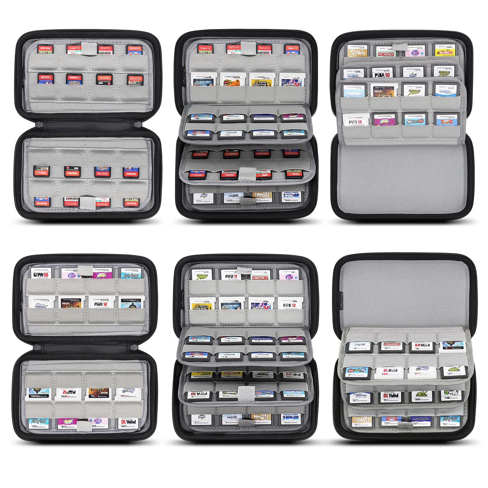 収納できる驚きの収納力!3DS・DS・SWITCH・VITAソフトカードまたはSDメモリカードが64枚収納できます。 ポーチ内側の4個仕切り。各仕切りパネルには、ゲームカードやメモリーカードを収納できる16「フロント8 /バック8」弾力性ポケットを搭載。 弾力性ポケットを採用し、ゲームカードやメモリーカードをしっかり包み込み、キズや汚れから保護します。 軽量で衝撃に強いEVA素材でカードをがっちり守る、セミハードポーチです。耐久性にも優れています。 開閉がスムーズなダブルファスナーを採用し、カードの出し入れがとっても簡単。