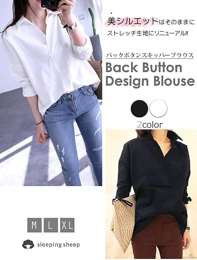 ストレッチ素材これ1枚で決まる王道の白シャツオフィスカジュアルVネック長袖ロングOLシャツブラウスレディース