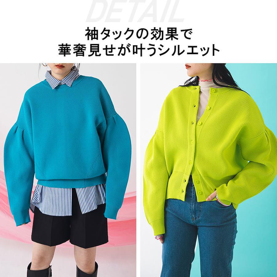 袖にタックを入れることで、女性らしさを演出。シルエットがしっかりでるニットだから、1枚でこなれ感、オシャレ度もUP。