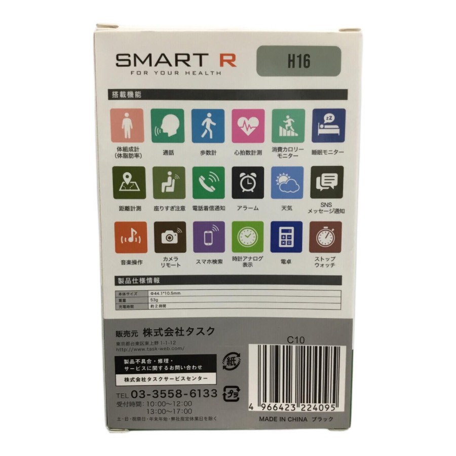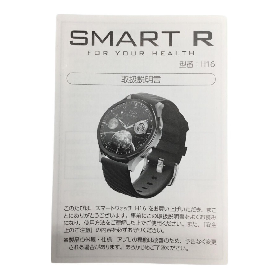 汚れ有(添付写真参照)■商品説明ブランド :SMART Rアイテム名 :スマートウォッチ型番 :H16対応OS :Android 4.4以上 / iOS 9.0以上ワイヤレス対応:Bluetooth 5.3動作確認 :通電確認のみバンド部分 :最短 約15cm / 最長 約20cm重量 :約53g※内部アプリの動作、及び通信契約サービスに関連する保証は致しかねますためあらかじめご了承くださいませ。またバッテリーに関しての持続時間については中古品という特性上保証が難しくなっております。合わせてご了承くださいませ。■付属品箱・取扱説明書・ケーブル付■その他必ず、商品注文される前に店舗情報に記載している注意事項をご確認ください。