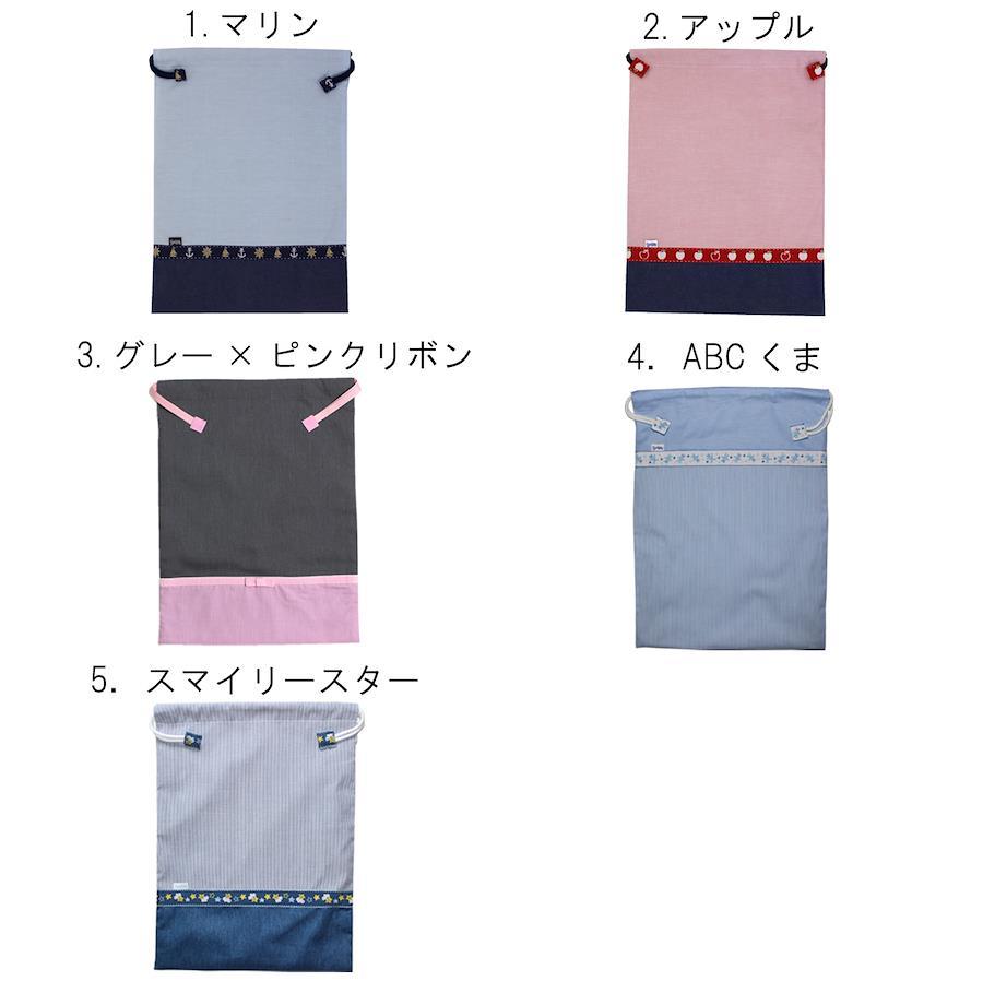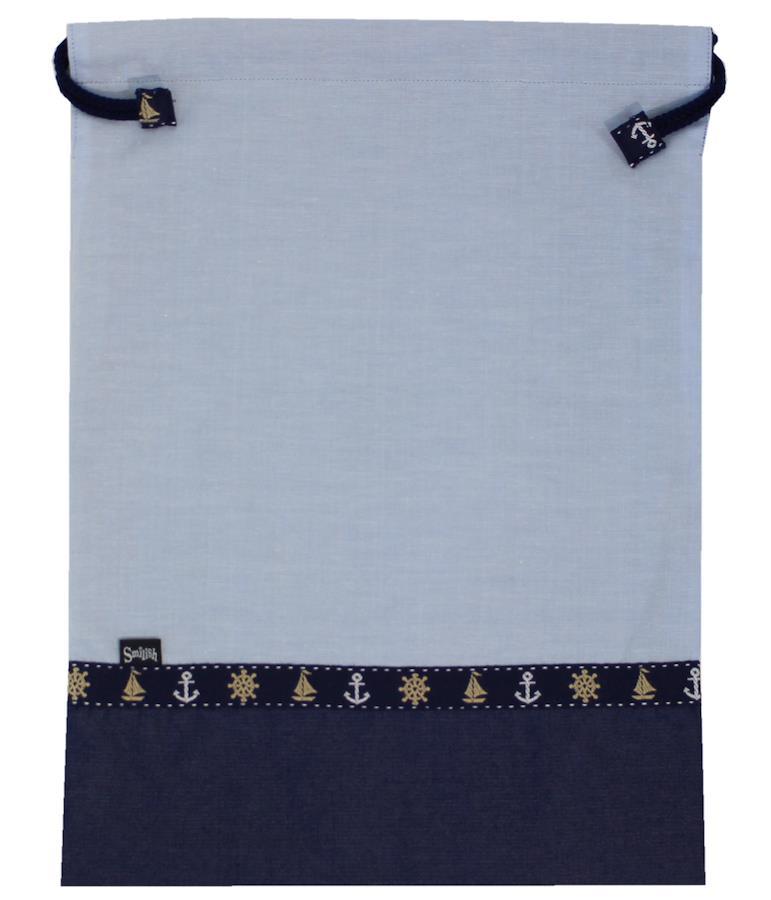 体操服、スモック、エプロンなどがすっぽり入る大きさの巾着タイプのお着替え袋。ナイロン裏地付きの丈夫でしっかりとした二重仕立て。シンプルで上品なデザイン。