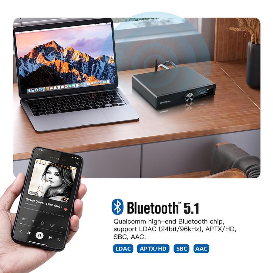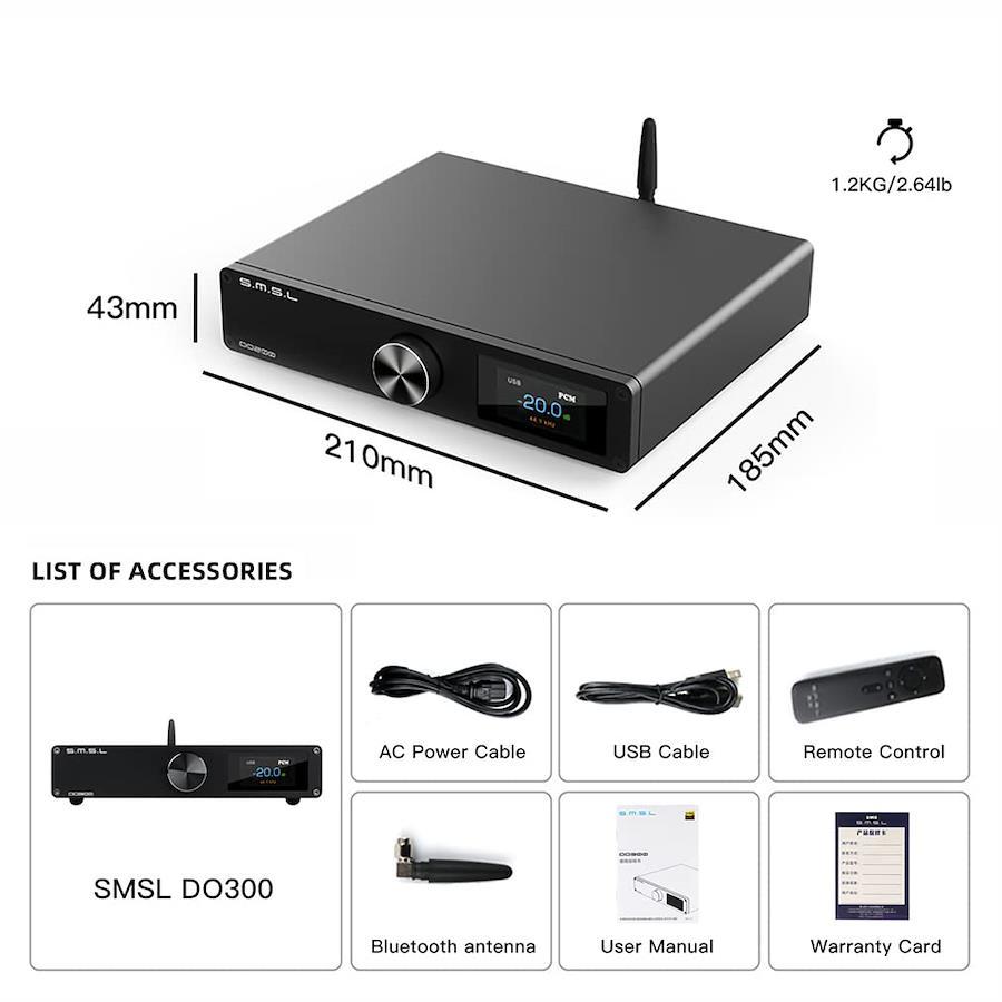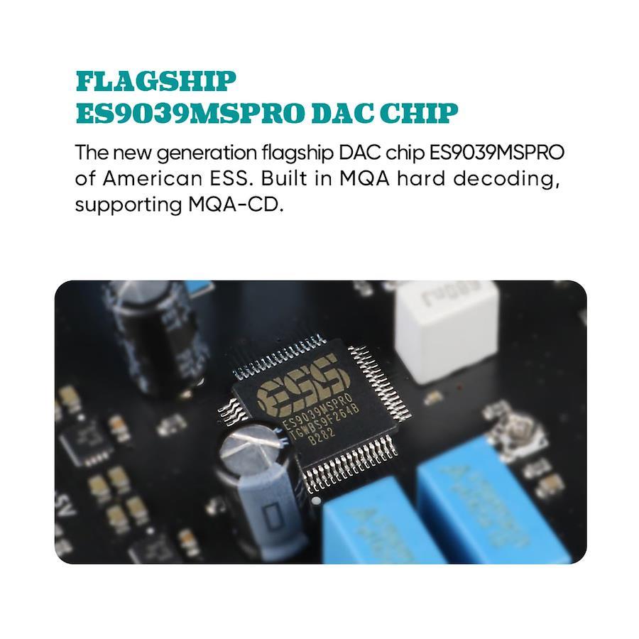 ? SMSL DO300は、ESSの新世代フラッグシップDACチップES9O39MSPROを採用しています。DSD512、PCM32bit/768kHzまでのサンプルレートに対応したXMOS XU316を採用します。? DO300はQualcomm QC5125 Bluetoothチップを採用し、LDAC(24bjt/96kHz)、APTX/HD、SBC、AACに対応しています。? DO300 DACは、低ノイズ電源処理を内蔵し、電力効率を高めながら、低消費電力化を実現しました。また、11個のハイエンドデュアルオペアンプと多数のオーディオファイルコンポーネントを使用しています。? USB