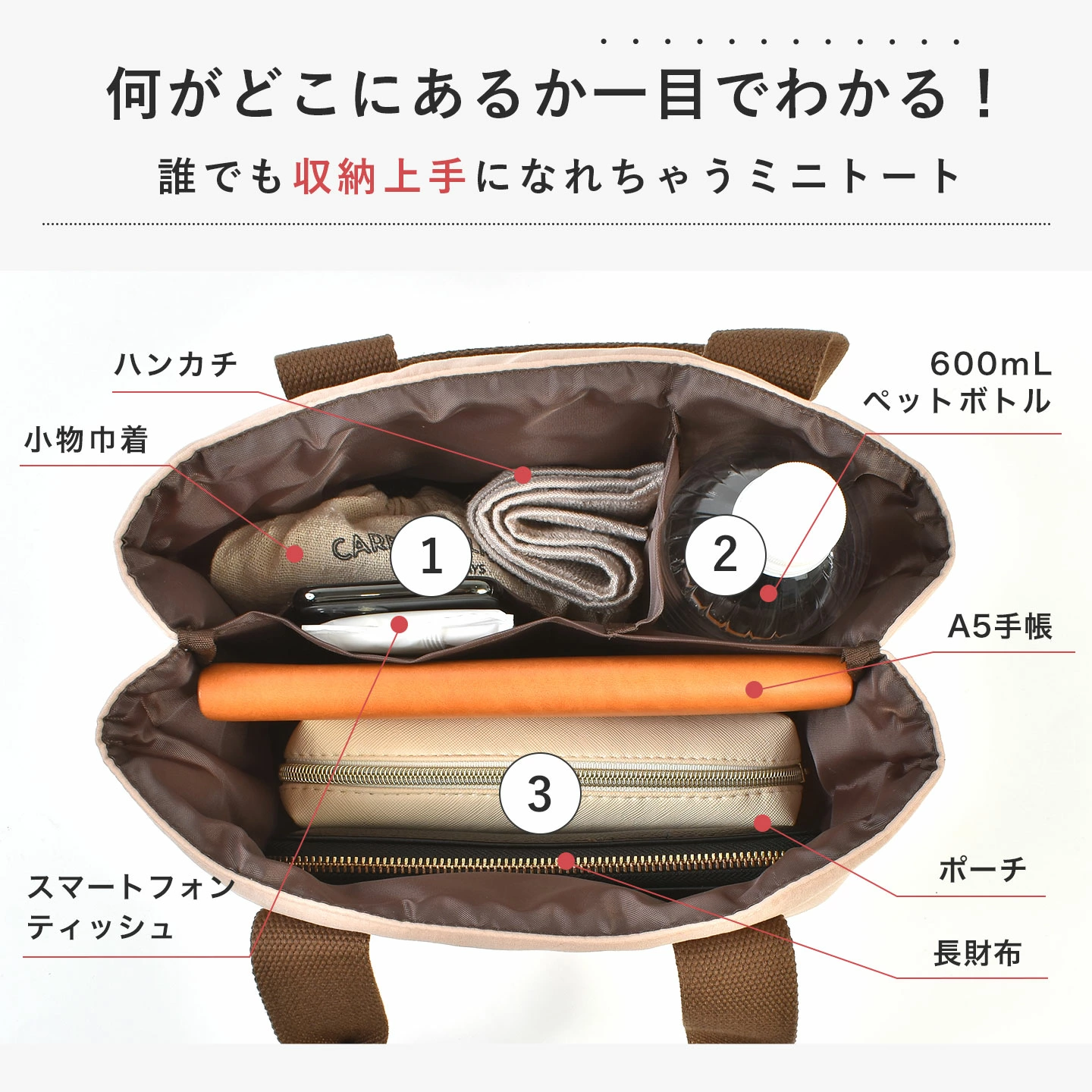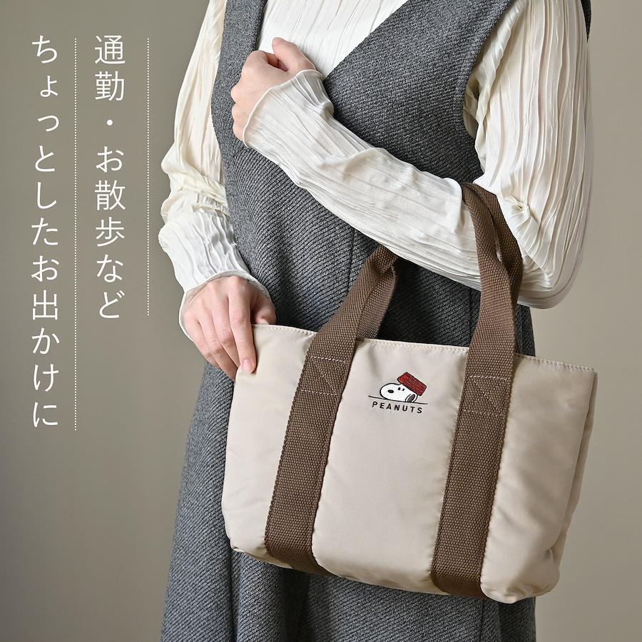 【収納上手ミニトート】スヌーピーのワンポイント刺繍がかわいい!便利な仕切り付きミニトートが登場。通勤やお散歩などちょっとしたお出かけにちょうどいいサイズのトートの中は、仕切りで3ルームに分かれて散らかりやすい小物を綺麗に見える化して整理整頓。広いマチとしっかりした生地で何も入れていなくても自立してくれます。シンプルなデザインで、ランチトートやマザーズバッグなど幅広いシーンで長く使えるアイテムです。