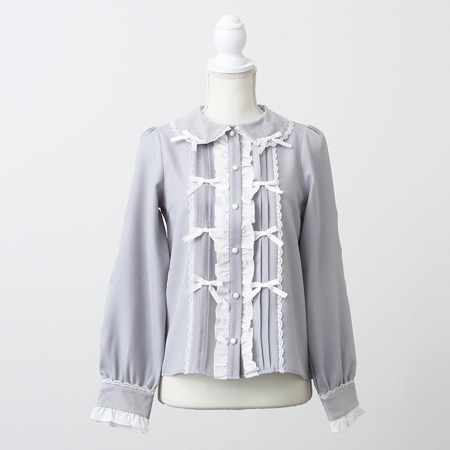 襟とカフスにキラキラビジューレースポイントのブラウスのご紹介【デザイン】襟とカフスにキラキラビジューのレースが重なっている可愛すぎるブラウスです。襟元と身頃にはTCテープのリボンがポイントです。襟とカフスがカラーによって配色デザインになっております。色々なボトムスに合わせやすく、かわいいコーデに欠かせないブラウスです。キラキラビジューのフリルとリボンがたっぷりの可愛すぎるブラウスになっております。【素材】さらりとした肌触りで、少し張り感のある素材感です。本体に裏地付き、脇ポケット付きです。脇ファスナー、後ウエストゴム付きです。【コーディネート】量産型、甘めコーデにオススメのかわいいブラウスです。色々なボトムスに合わせてやすくカラーも沢山あります♪《透け感》あり 《生地の厚さ》普通 《裏地》なし 《伸縮性》なし《生産国》中国