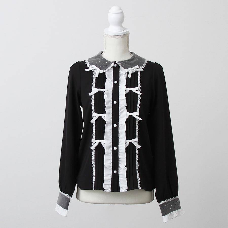 襟とカフスにキラキラビジューレースポイントのブラウスのご紹介【デザイン】襟とカフスにキラキラビジューのレースが重なっている可愛すぎるブラウスです。襟元と身頃にはTCテープのリボンがポイントです。襟とカフスがカラーによって配色デザインになっております。色々なボトムスに合わせやすく、かわいいコーデに欠かせないブラウスです。キラキラビジューのフリルとリボンがたっぷりの可愛すぎるブラウスになっております。【素材】さらりとした肌触りで、少し張り感のある素材感です。本体に裏地付き、脇ポケット付きです。脇ファスナー、後ウエストゴム付きです。【コーディネート】量産型、甘めコーデにオススメのかわいいブラウスです。色々なボトムスに合わせてやすくカラーも沢山あります♪《透け感》あり 《生地の厚さ》普通 《裏地》なし 《伸縮性》なし《生産国》中国