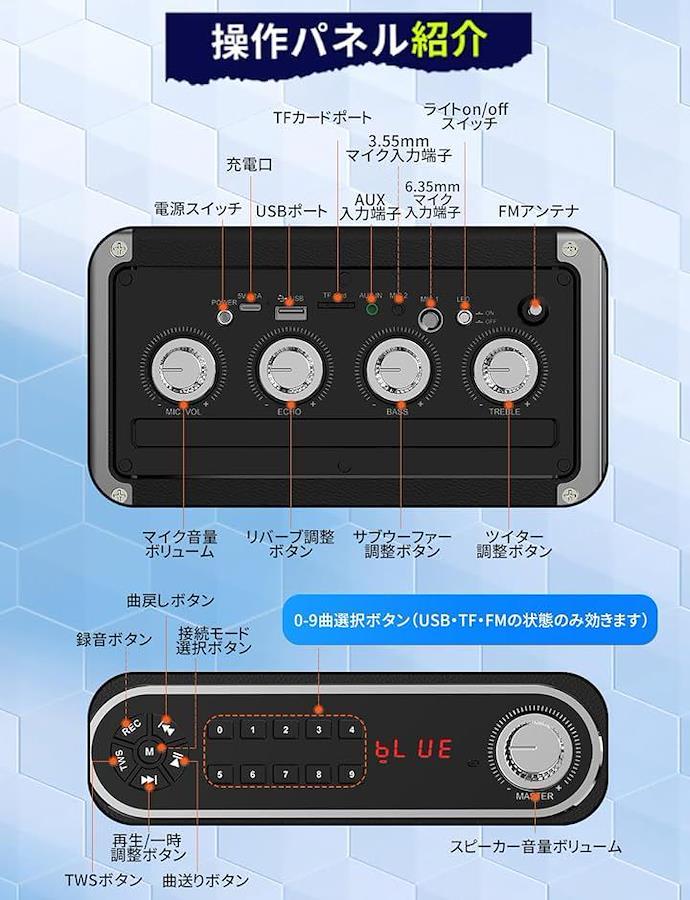 *マイクが音が出ない場合はまず新しい電池を交換して、スピーカーの操作バネルーにマイク音声調整専用のボリューム(-MICVOL+)を増大してから、音声が出ます。
