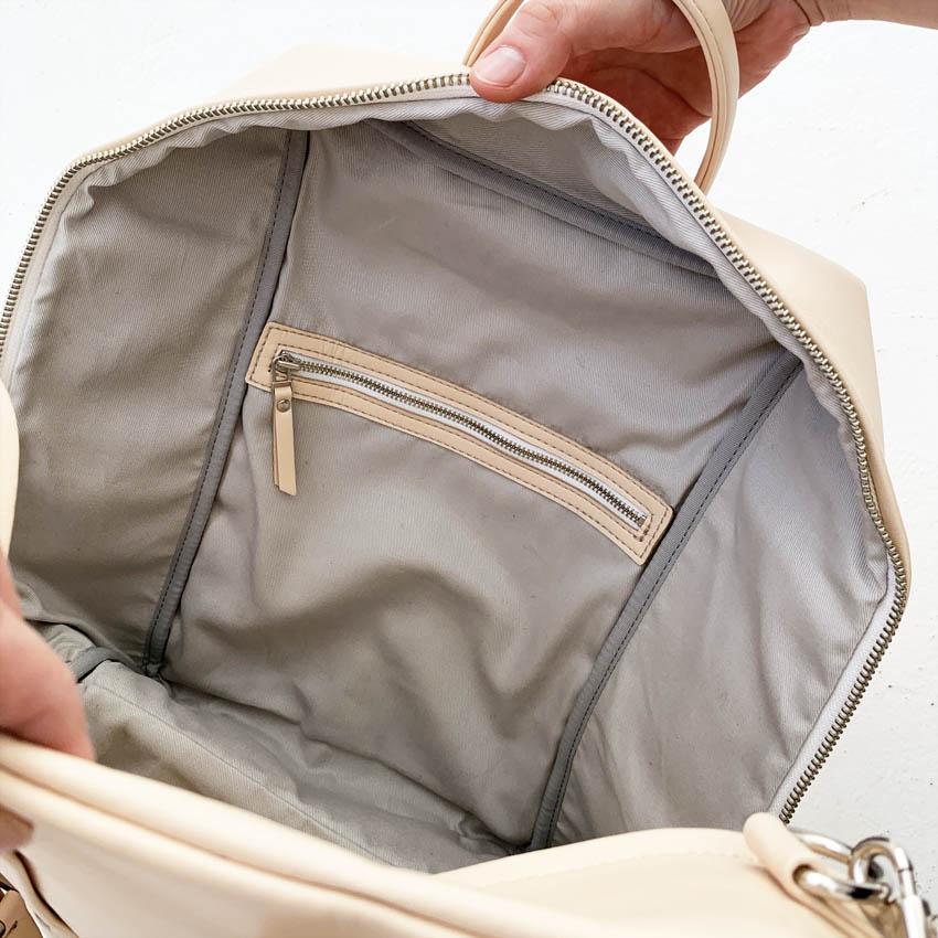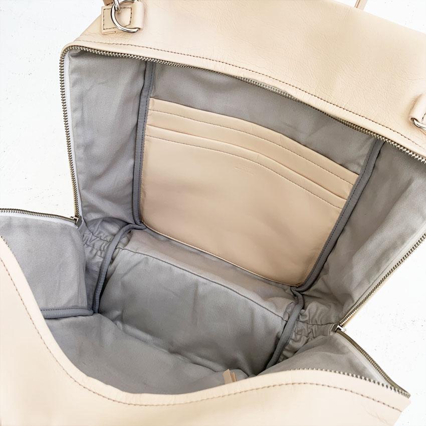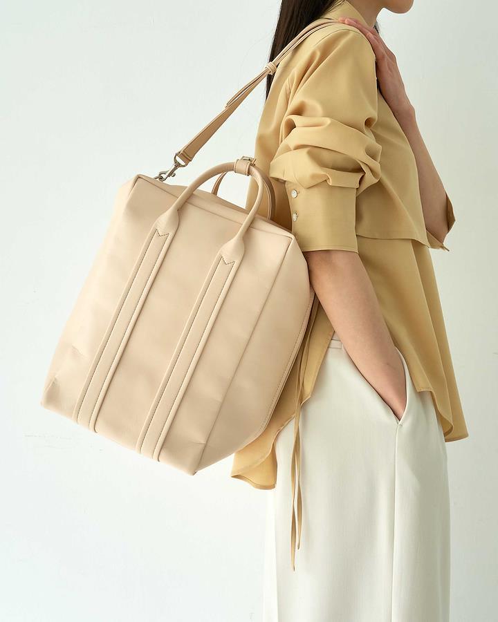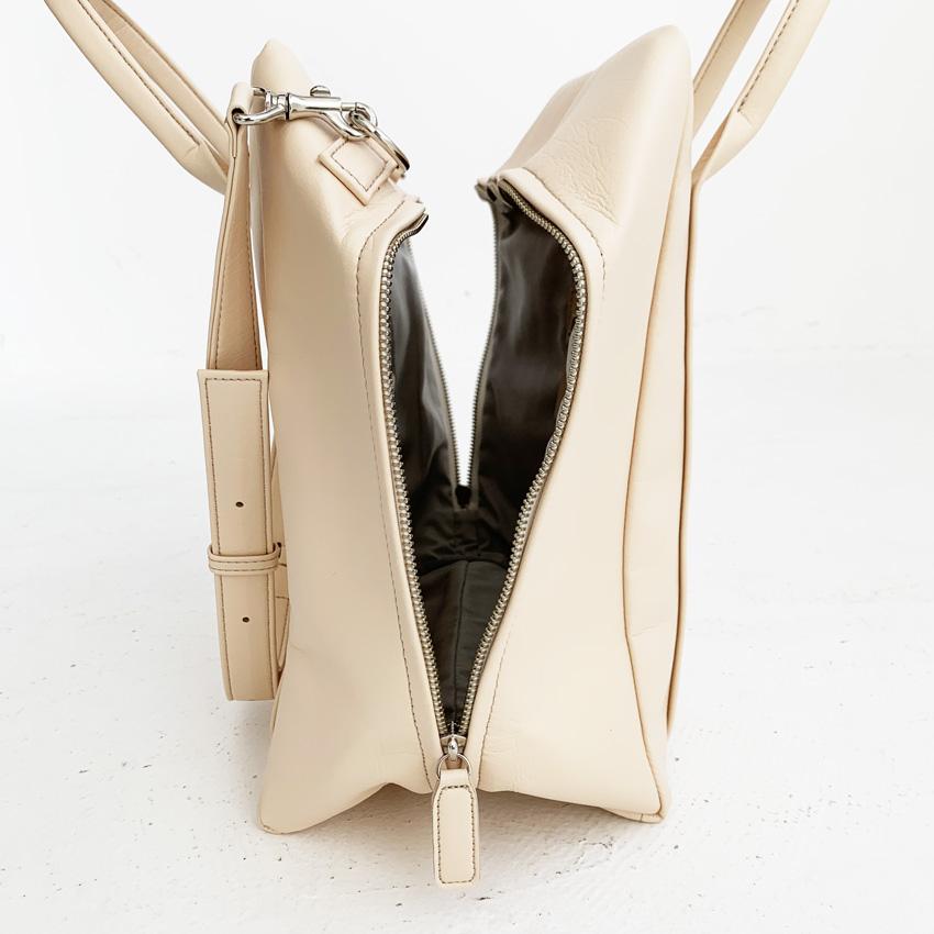 ファスナーが底の近くまで開くので、荷物の出し入れがしやすく便利です。マチが大きく、A4サイズの書類も沢山入るため、日常使いはもちろん仕事用としてもお持ちいただけます。シックでシンプルな形状はどんなコーディネートにも合わせやすく、メンズライクなスタリングにも◎。