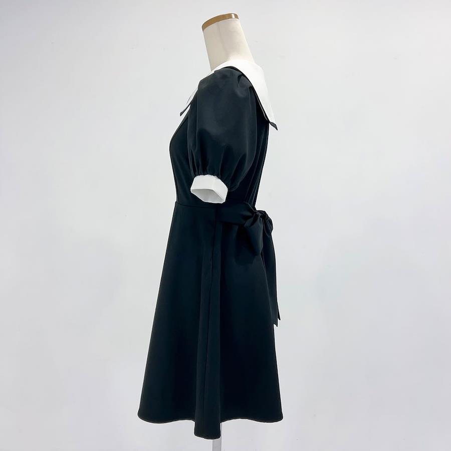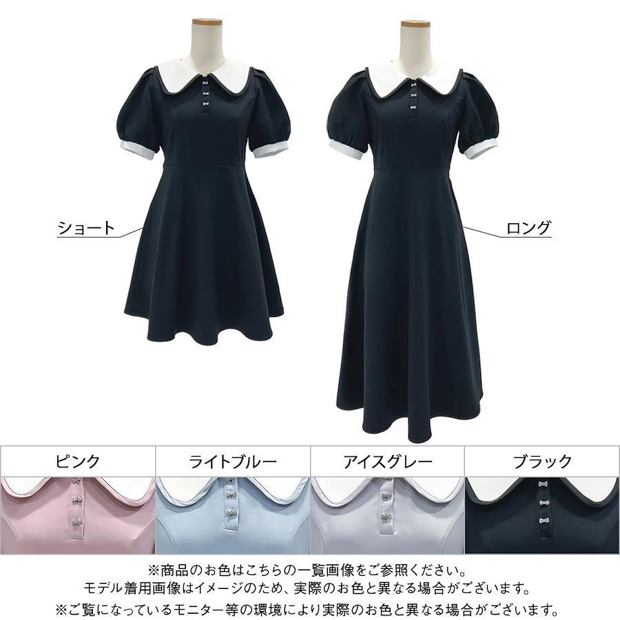 襟パイピングデザインと前立てのきらきらビジューリボンがアクセントの可憐なワンピース。