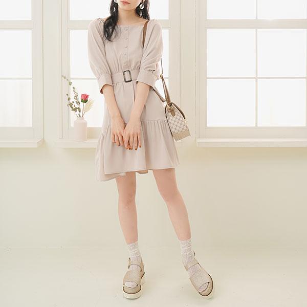 きゅっとウエストをしめれるベルトとスクエアネックラインがスタイルアップ効果を後押し。