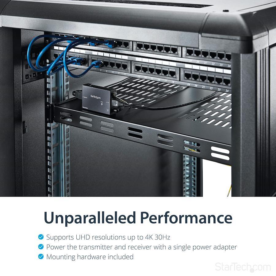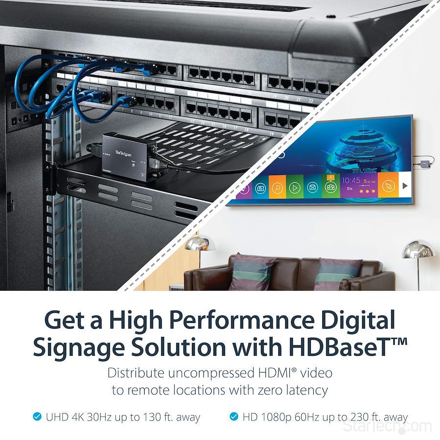 3営業日以内に発送≪新品未開封品≫:1本のカテゴリ5e/6 ケーブルを介し、HDMIビデオを最大70mまで延長するHDBaseTエクステンダキット。超HDとフルHD解像度(4K / 1080p)、3D、デジタルオーディオに対応しています。また、パワーオーバーケーブル(POC)を使用し、単一の電源から受信機と送信機の両方に給電します。汎用性が高いこのビデオエクステンダは、ショッピングセンター、スタジアム、学校、病院など、大規模な建物内でのデジタルサイネージに最適なソリューションです。HDBaseTは、HDMI信号の伝送をまったく新しいものに変える、遅延のないビデオ伝送技術規格です。HDBaseT は、無圧縮のHDMI動画&音声、100BaseT イーサネット、IR、RS-232シリアル、パワーオーバーケーブルなどを伝送できる最新のモジュレーション方式を使用しています。このHDBaseTエクステンダは、単一のキットでHDBaseT 技術によるHDMIと電力の伝送機能を提供する完全エンドツーエンド ソリューションです。従来のHDMIエクステンダや単独のHD