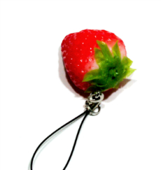 本物のいちごを型どりしてキーホルダーとストラップにしました。みずみずしい発色は単に赤で塗っただけじゃないんです。リアルさを出すために、何色も重ねています。みずみずしいツヤも再現しました。