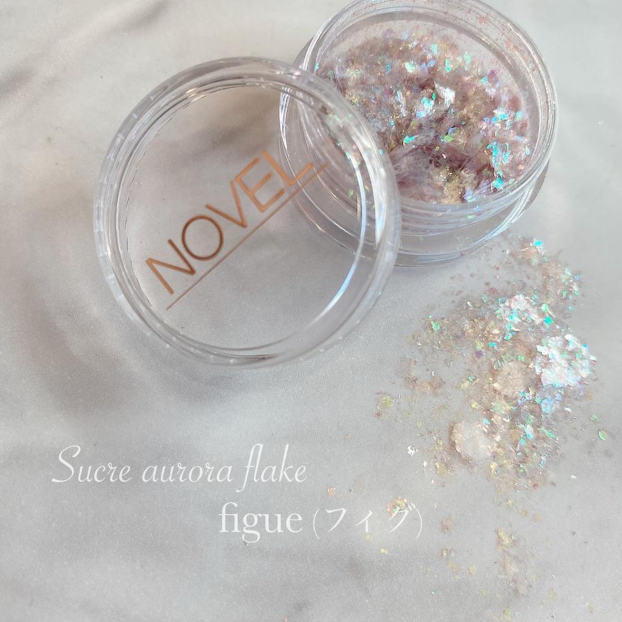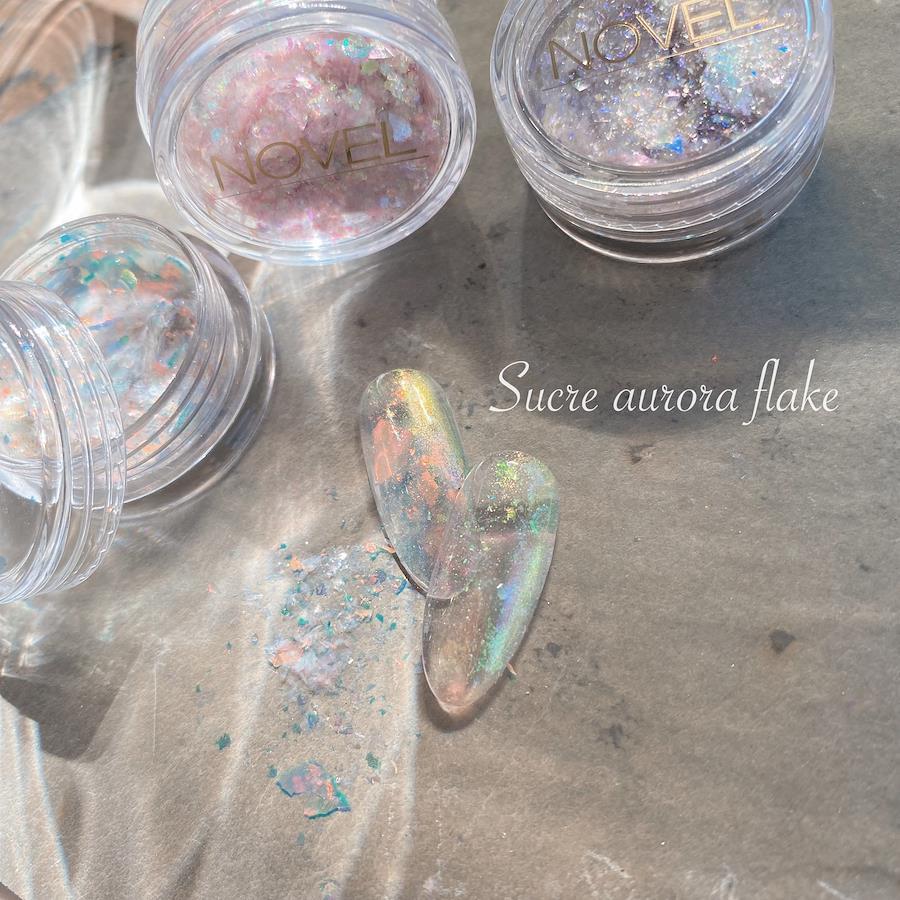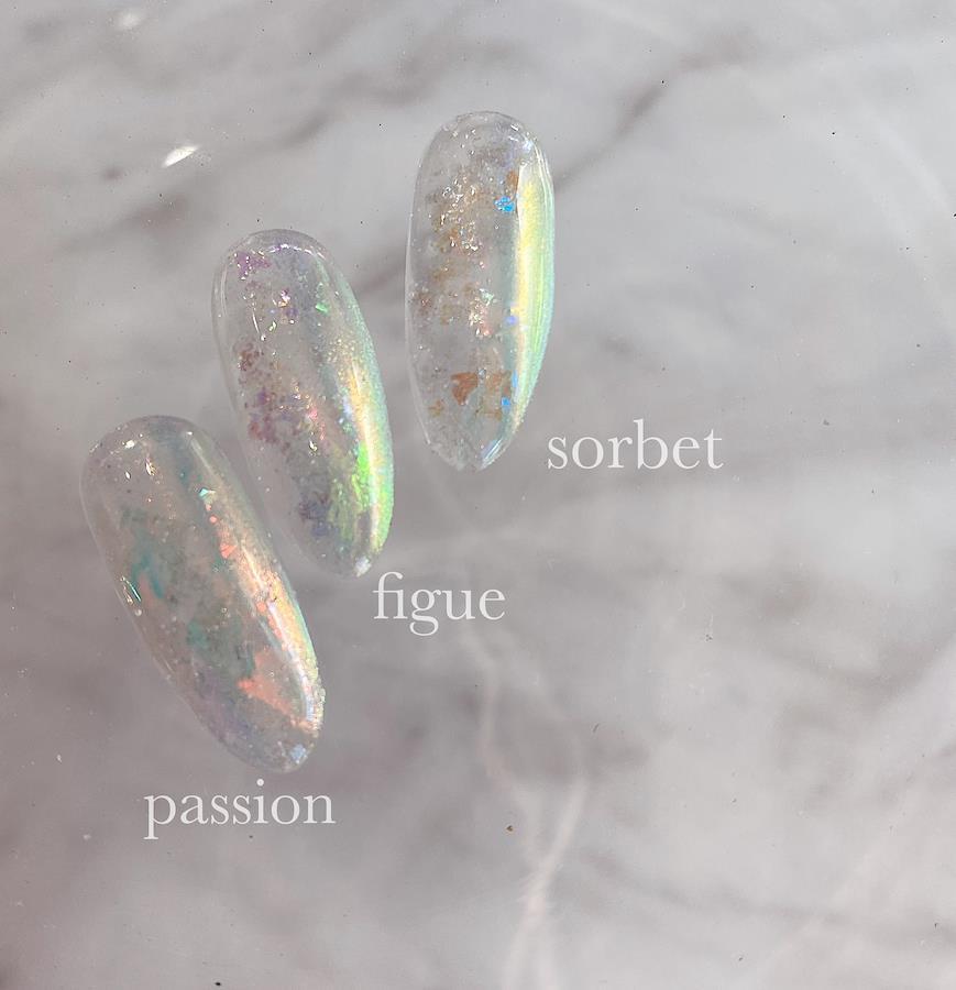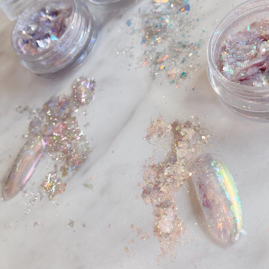既存のファンシーオーロラフレークより輝きや光沢感が強いながらも、ほんのりダスティー感があるフレークです。光の当たる角度により表情が変わります。非常に埋め込みやすいので本品の上にカラーやアートを重ねて奥行き感を演出することが出来ます。