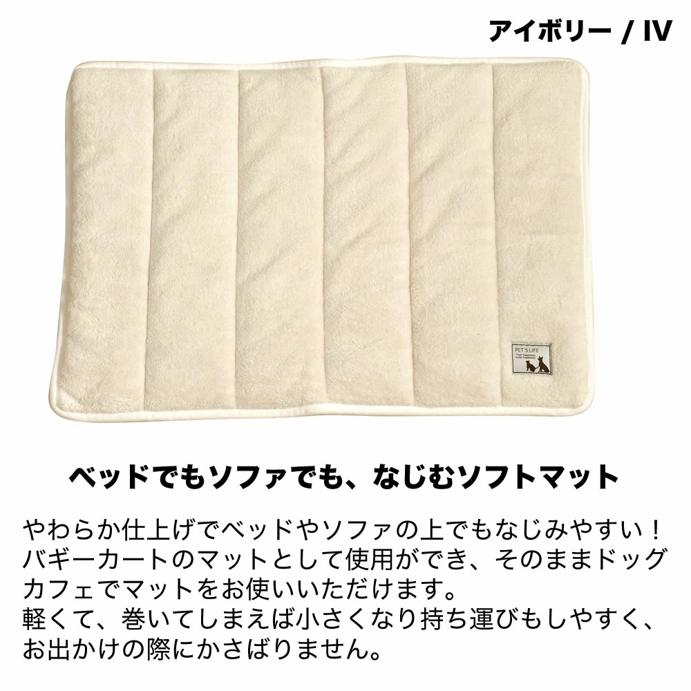 やわらか仕上げで、ベッドやソファの上でもなじみやすい!バギーカートのマットとして使用ができ、そのままドッグカフェでマットをお使いいただけます。軽くて、巻いてしまえば小さくなり持ち運びもしやすくお出かけの際にかさばりません。ソファの上や、フロアーシートとしてはもちろんゲージ用にもお使いいただけます。柔軟性、吸水性に優れたマイクロファイバーをたっぷり使用丸洗いOK!