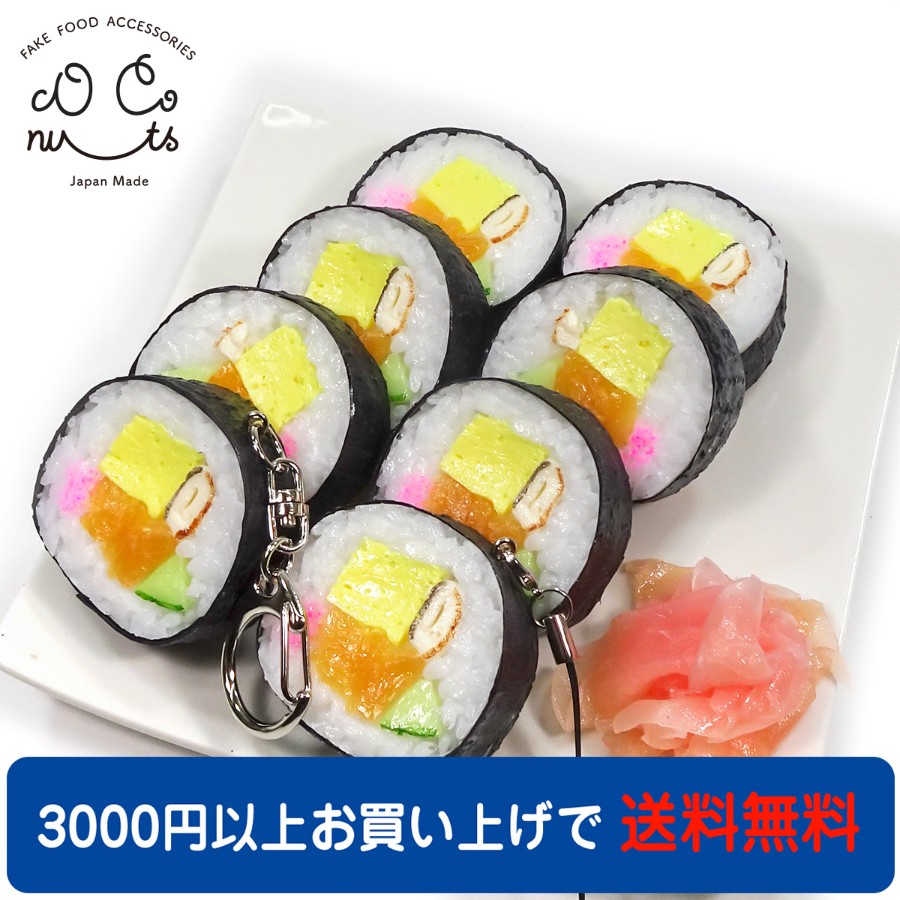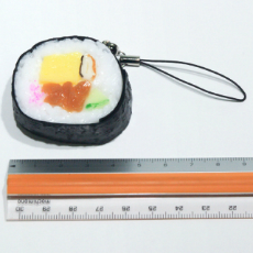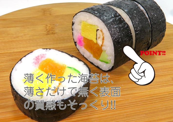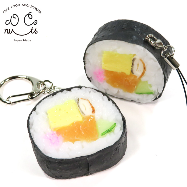 本物の巻き寿司から型どりして作った食品サンプルアクセサリーです。薄く巻いた海苔は薄さだけで無く、表面の質感も本物そっくりです。