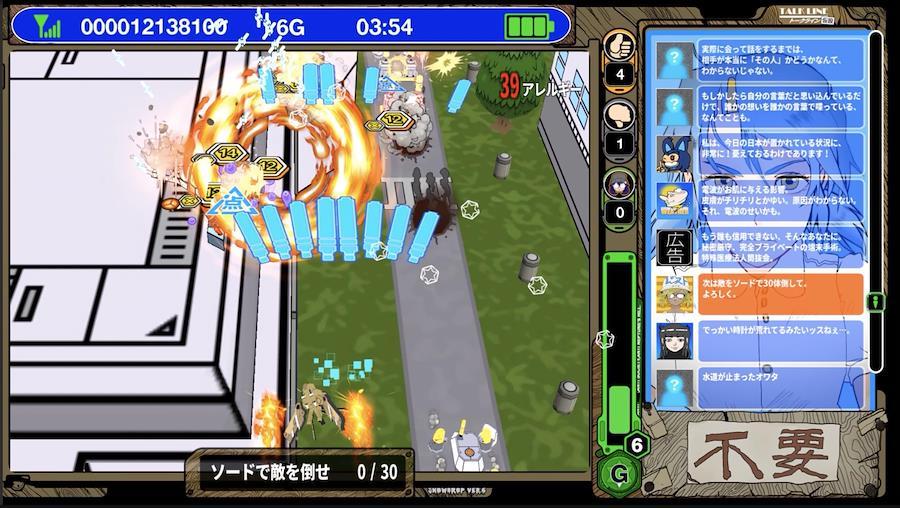ダブルスティックで操作する「村雨(むらさめ)」は、敵やアイテムを獲得し自機が進化します。レーザーや回転斬りなどの強力な攻撃を繰り出せるようになる爽快感のある機体です。