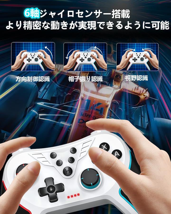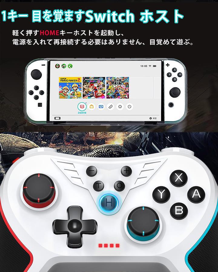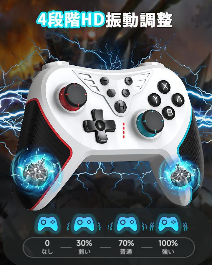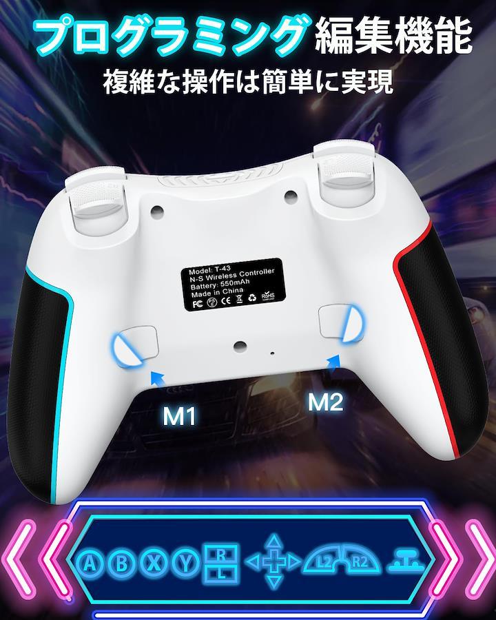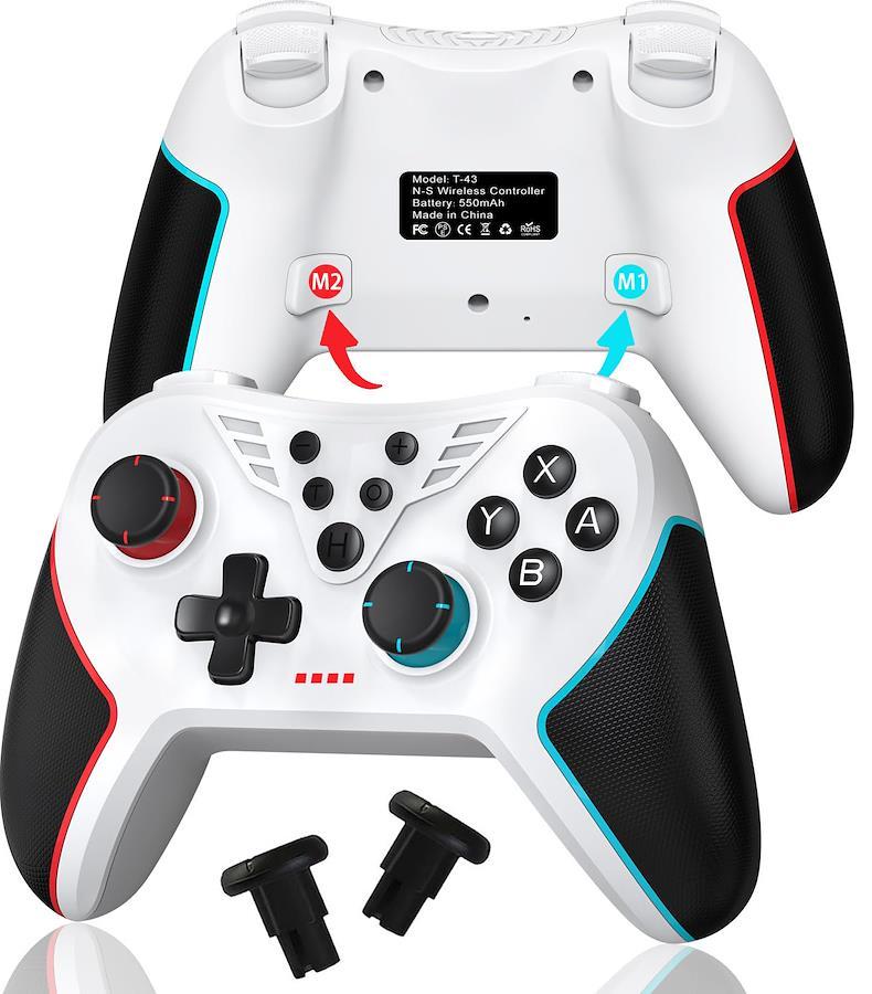 (Switch Wireless Controller Compatible Devices) Switch controller is applied to all switches. Applicable platform Switch series, PC The latest Switch controller can play games such as Monster Hunter Rise and the Legend of Zelda Breath of the Wild. (★Note: If there is any problem with the product, please reset it by the hole behind the controller. ) (Multifunction than genuine product) Equipped with a multi-function that is not equipped with genuine procons. It supports a variety of functions including macro function, 2 rear buttons, automatic continuous firing (continuous firing hold), Bluetooth 5.0 connection, 6-axis gyro sensor, 3-stage turbo rapid firing speed, 4-stage HD vibration, LED light, and low voltage alert. It also has a rapid fire function, which can adjust shooting speed in 3 stages, 5 times/sec, 12 times/sec, and 20 times/second. This allows you to defeat your opponents with more firepowers as you increase the playability of your action game or run rapidly on FPS. With built-in 6-axis gyro sensor and high resolution vibration motor, the race game detects tilt of the controller, and the tilt sensor operates smoothly drift and provides intuitive movement control. Switch controller provides accurate operation and a more realistic gaming experience with vibration feedback and various changes Δ【Stable Bluetooth 5.0 Function & Fast Charging】Built-in advanced wireless chip reaches 2.1Mbps data transfer rate. If only 0.01 second faster than your opponent, the victory will lean to you. Can be connected to Switch up to 10 meters distance Since it is a wireless controller, it is equipped with a 550 mAh large capacity rechargeable battery, so you can freely operate it as you like. USB interface fast charging It can be fully charged in 1 to 1.5 hours, and can be played continuously for 10 to 15 hours. The included TYPE-C cable allows you to switch between wired and wireless freely. So you can control it with a high degree of freedom, no delay, and play your game neatly Δ【Macro editing function & automatic continuous firing function】 Equipped with two back buttons (M1 and M2), press the macro button at the same time to enter programming mode. The macro button can be mapped with each function button (A/B/X/Y/L1/L2/R1/R2 Up/Down/Left/Right Buttons) and can enter up to 25 commands in one program. By assigning a series of key operations to one button, it is convenient for registering multiple continuous operations and special tricks frequently used during games Δ【HOLE JOYSTICK】Hole joystick detects the position and direction of the joystick by detecting changes in the magnetic field. The output signal is more stable and accurate and will not be affected by the aging and wear of resistance or inductance. Therefore, the joystick of the hole has no mechanical contact components, so the life and reliability is higher than a normal joystick. 12-month quality guarantee. If you have any questions, please feel free to contact us through your order history
