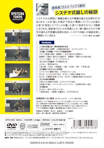 軽く触れただけで相手が崩れる!? システマの大原則に 【健康な戦士は不健康な戦士を圧倒する】 があります。 これを【崩しの視点】で見ると 緊張して「バランスの崩れた者」は 安定して「バランスの整った者に依存」する という解釈になります。 システマ創始者ミカエルが得意とした 軽く触れただけで相手が崩れる不思議な技術も含め システマ式崩しの秘訣をこのDVDで詳しく解説していきます。 (システマ東京 北川貴英) システマ…ミカエル・リャブコが武術を元に創始したトレーニングシステム。呼吸を核とした独自のアプローチで心身のパフォーマンスを引き出し、サバイブする力を養う (収録内容) ■1)自分を整える…相手を依存させる 【①相手が崩れる要素】 【②姿勢反射を使う】 【③バランスのワーク】 ■2)崩しへの発展…バランスの回復を使う 【バランス回復の原則】 【実践例…①大きく崩された状態から】 【実践例…②僅かに崩された状態から】 【実践例…③触れられる前の崩し】 【ワーク…①座位】 【ワーク…②グラウンド】 ■3)バランスを崩す…7つのポイント 【はじめに…背骨を曲げる】 【①首と肩】 【②水月】 【③鼠蹊部】 【④膝】 【⑤足首】 【⑥肘】 【⑦手首と指】 ■4)接続=コネクションの利用 【①リラックスと緊張の両立】 【②手足のフレーム化】 【作り方…①こちらの手で作る】 【作り方…②相手の緊張で作る】 【作り方…③緊張を背骨に入れる】 【作り方…④緊張を背骨から引き出す】 ■5)その他の実践例 【①寄りかかる動作の利用】 【②ストライクでの崩し】 【③武器での崩し…ナイフ/スティック/シャベル】 【④目測を利用した崩し】 ■6)制圧法 【はじめに…投げっぱなしにしない】 【①背骨を捻る】 【②頭側に位置取る】 【③片手を空ける】 指導監修◎北川貴英 きたがわ たかひで システマ東京代表 2008年にシステマ創始者ミカエル・リャブコより公認インストラクターとして認定され、以降も毎年の海外研修で研鑽を積む。『人生は楽しいかい』(夜間飛行)など著書多数。現在、東京の2カ所の常設ジム(白山、原宿)を中心にシステマの指導普及に奮闘中。最新書籍『達人の条件』(BABジャパン)。 指導協力◎伊藤烈 鈴木太 高森裕一 五十嵐義明