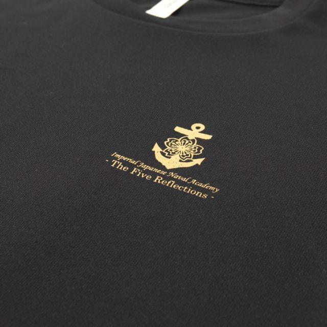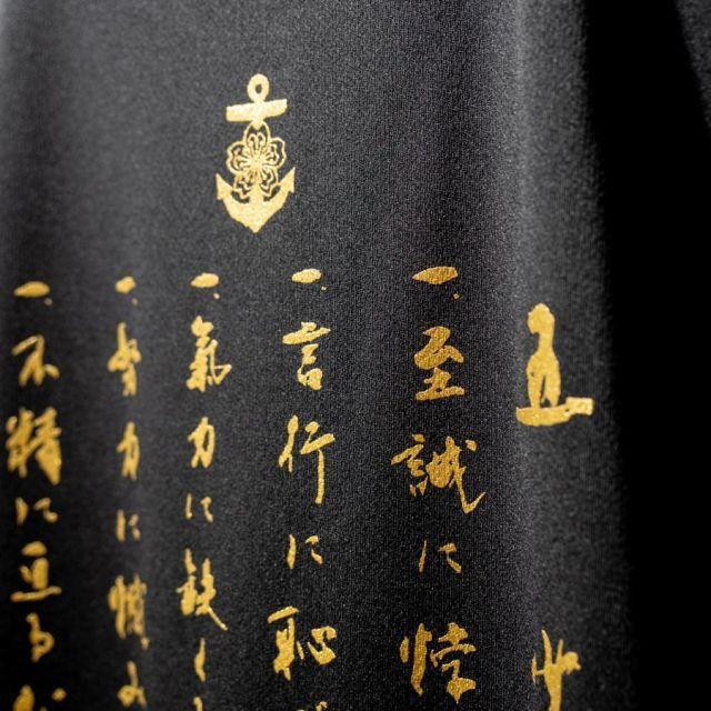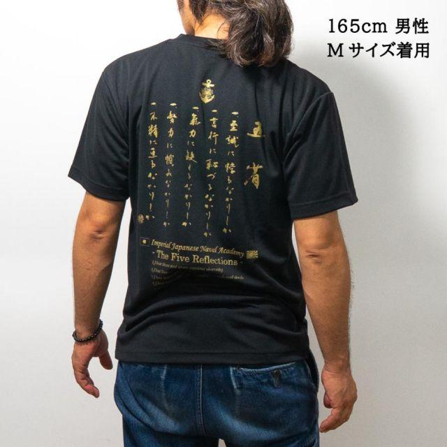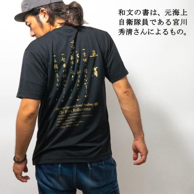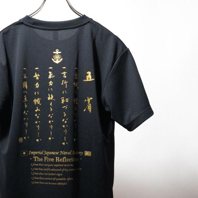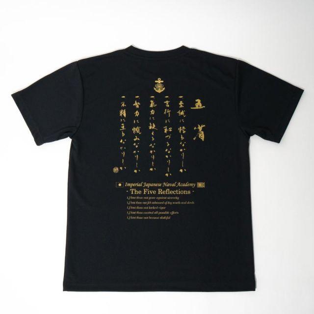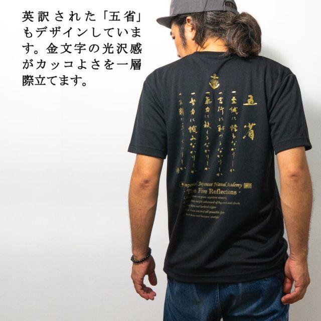 商品名:Tシャツ ( 五省 英語 ver ) The Five Reflections ごせい 大日本帝國海軍 ドライ 海上自衛隊 海自 自衛隊 江田島 海軍兵学校 トップス 半袖 ウェア江田島にある旧大日本帝国海軍の海軍兵学校(現在は海上自衛隊幹部候補生学校)において用いられた五つの訓戒「五省」が記されたTシャツ。英訳された「五省」もデザインしています。胸元には「桜イカリ」のワンポイントを。和文の書は、元海上自衛隊員である宮川秀清さんによるもの。金文字の光沢感が、カッコよさを一層際立てます。旧海軍兵学校訓示<五省(ごせい)>一、至誠(しせい)に悖(もと)る勿(な)かりしか真心に反する点はなかったか一、言行に恥づる勿かりしか言行不一致な点はなかったか一、気力に缺(か)くる勿かりしか精神力は十分であったか一、努力に憾(うら)み勿かりしか十分に努力したか一、不精に亘(わた)る勿かりしか最後まで十分に取り組んだか●カラーTシャツ:ブラック文字:ゴールド●サイズ(cm)S:胸囲94・着丈65・肩幅44M:胸囲100・着丈68・肩幅46L:胸囲106・着丈71・肩幅48LL:胸囲112・着丈74・肩幅503L:胸囲120・着丈77・肩幅534L:胸囲128・着丈80・肩幅565L:胸囲136・着丈82・肩幅59