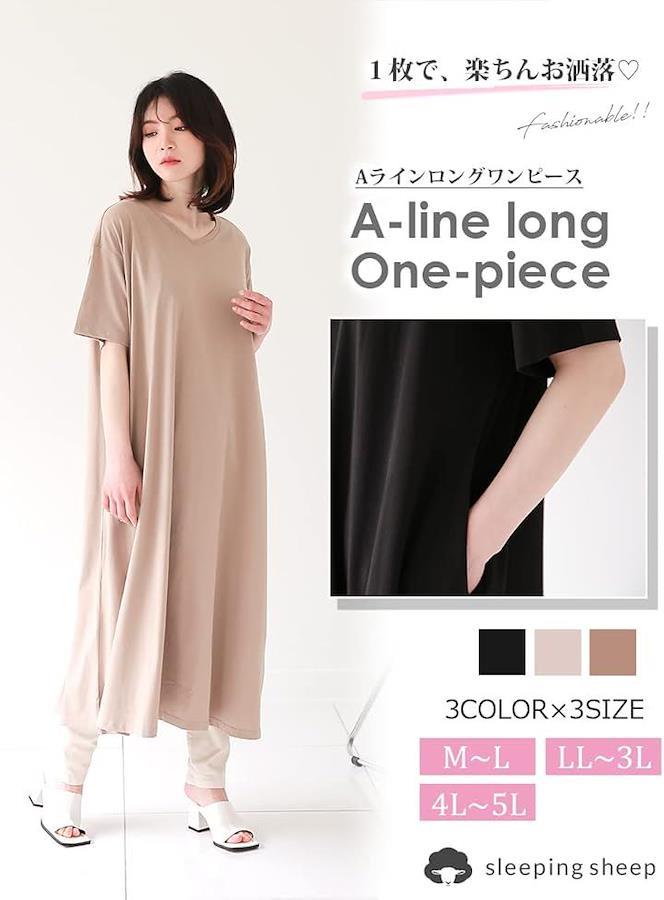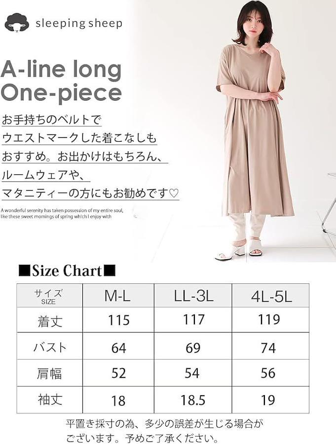 *カラー グレーベージュ・モカ・ブラック *サイズ M-L・LL-3L・4L-5L *寸法 M-L :着丈115cm バスト64cm 肩幅52cm 袖丈18cm LL-3L:着丈117cm バスト69cm 肩幅54cm 袖丈18.5cm 4L-5L:着丈119cm バスト74cm 肩幅56cm 袖丈19cm *サイズはすべてスタッフの平置き実寸サイズです。