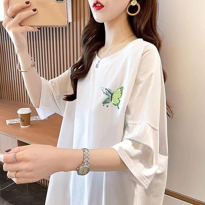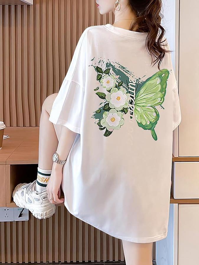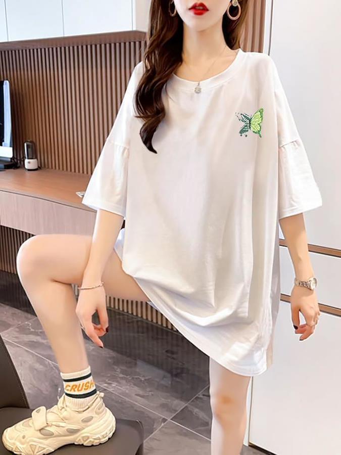 左胸に描かれた蝶と花のモチーフが、コーデに程よいアクセントを加え、シンプルながらもこなれ感を演出します。