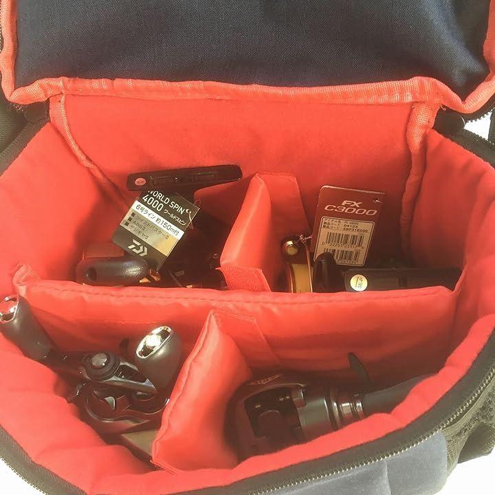 下部分には着脱可能なテープ付きのクッション入り仕切りが4枚付属しておりベイトリール、スピニングリール、ルアーケース、小物入れの各サイズにフィットさせて収納できます。