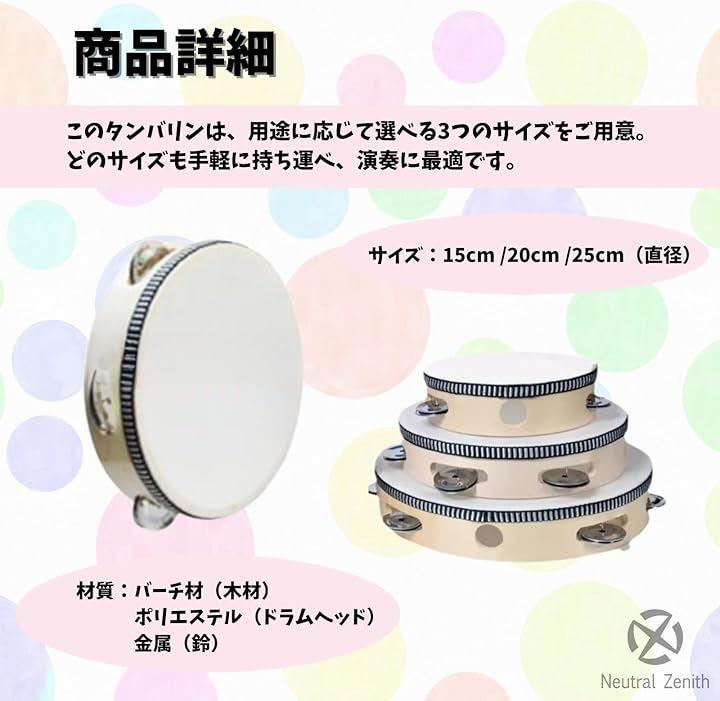 「商品詳細」材質:バーチ材(木材)、ポリエステル(ドラムヘッド)、金属(鈴) サイズ:15cm / 20cm / 25cm(直径) このタンバリンは、用途に応じて選べる3つのサイズをご用意。
