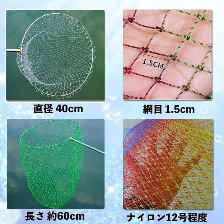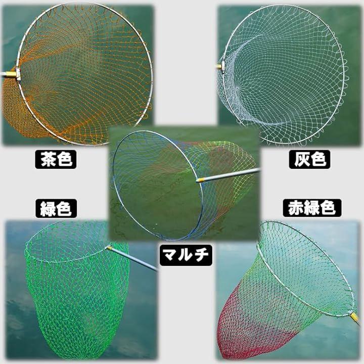 ナイロン撚り糸製のカラーたも網、網全体にハリがあり,水中で抵抗が少ないので,魚を掬う時に水中のタモ網を動かしやすいです。