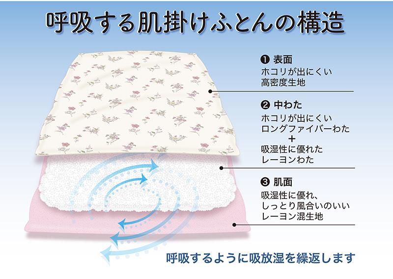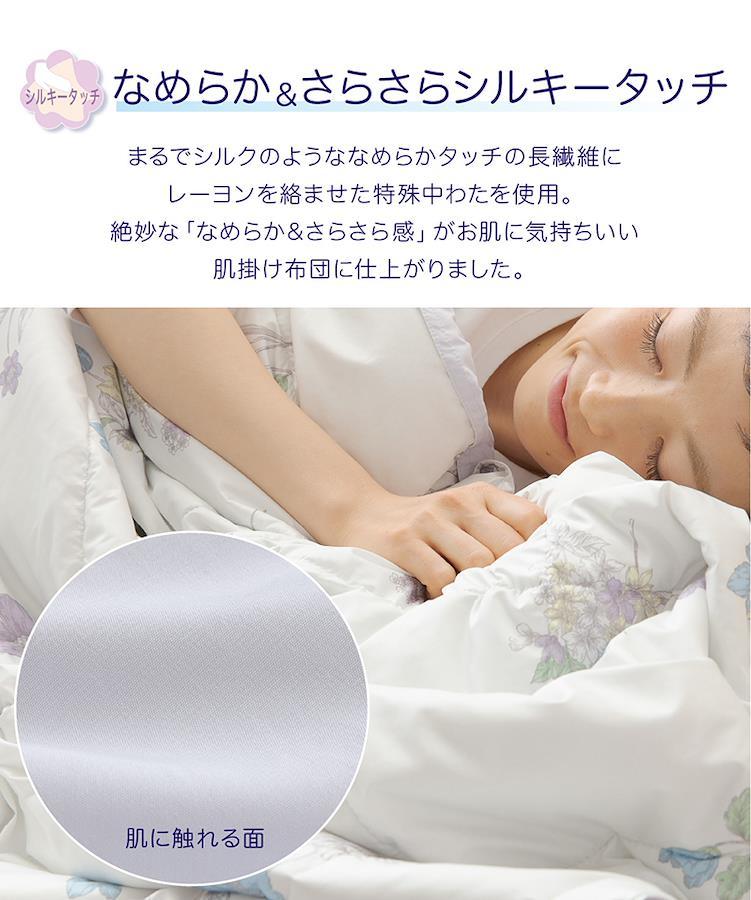 ★まるで呼吸するように優れた吸放湿性を発揮する、肌掛け布団!*中綿にポリエステルの長繊維とレーヨンを絡ませた特殊中綿を使用することで、シルクのようななめらかな肌触りと、さらさら感のある布団に仕上がりました。*中綿は、真綿布団のように1点ずつ手引きで形を整えています。*肌面にもこだわり、しっとりと風合いのいいレーヨン混の生地を使用しています。絶妙な「なめらかさ&さらさら感」がお肌に気持ちいい布団に仕上がりました。*表地に高密度生地を使用し、中綿に長繊維を採用することで、ホコリの出にくい布団になりました。羽毛の肌掛け布団と比べても、1%以下のホコリ量です。*洗濯機:可(ネット使用)