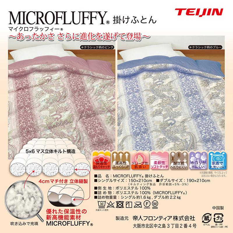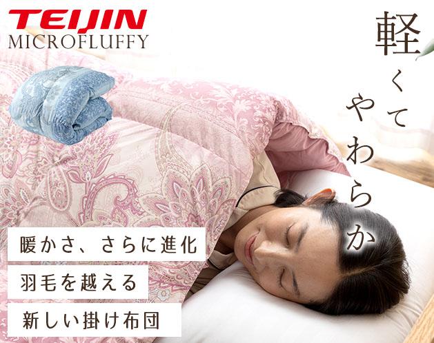 ★ふわふわのボールわたが体を包み込む、羽毛を越える新しい掛け布団!*テイジン独自の新機能素材、MICROFLUFFY(マイクロフラッフィー)は、厳選された数種類の極細特殊繊維を特殊製法でブレンド加工を施しております。まるで羽毛のような保温性、暖かさを実現し、しかも軽くて柔らかな掛け布団に仕上がりました。ドレープ性(肌沿い)も高く、嵩高性や耐久性にも優れています。*臭いもなく、わたホコリの発生も少なく、洗濯などの取り扱いが楽なのも嬉しいポイントです。またネットに入れて洗濯機で丸洗いができるので、清潔にお使いいただけます。*身体にフィットする立体キルト採用で、寝返りを打っても隙間ができにくく暖かさをキープします。側生地には肌触りの良い高密度生地を使用し、肌触りのいい5×6の立体キルトはマチ付の立体構造なのでボリューム感があります。