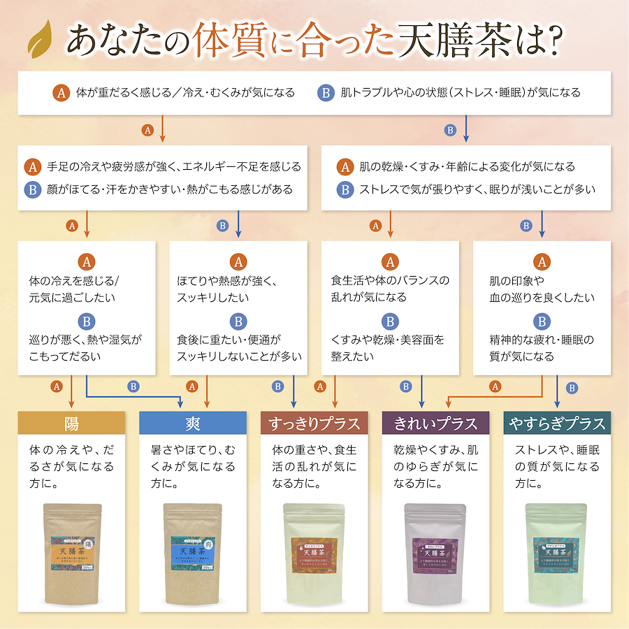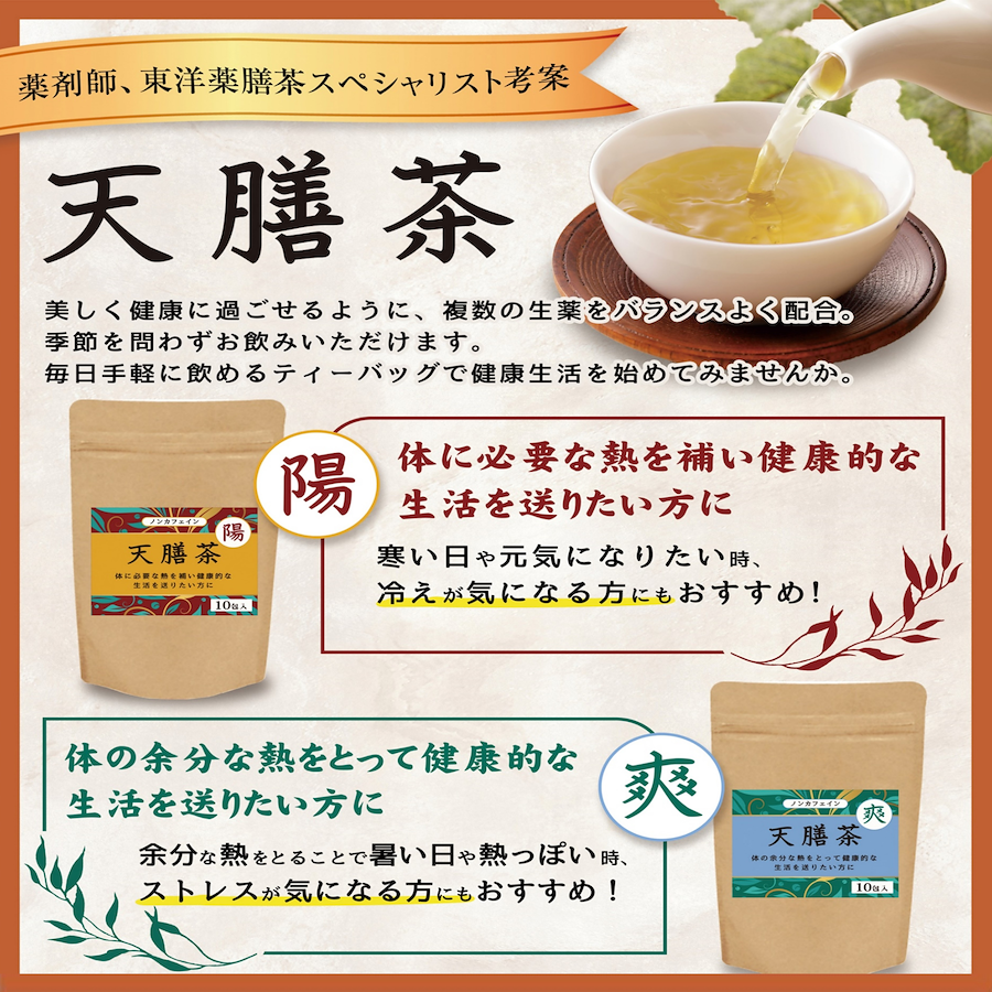 Tenzen Herbal Tea is available in five varieties.The "Yo" and "Soh" blends form the basic series-one warm and comforting, the other cool and refreshing.In addition, the "Plus Series" adds selected herbs for more fragrant aromas and richer flavors. Whatever the season or occasion, you can choose the blend that suits your mood.