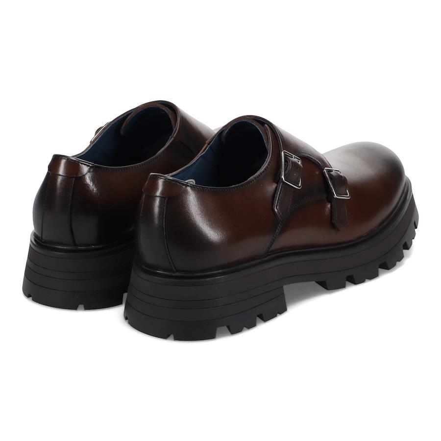 | トラックソール×ダブルモンク 【素材】 しなやかで艶のある牛のワックスレザーを使用。 ※本革を使用していますので、多少のムラ、小傷がございます。 【デザイン】 ドレッシーなアッパーデザインに、ラウンドフォルムとボリュームソールでカジュアルさを加えたドレスカジュアルシューズ。 デニムやカーゴパンツなどのワークパンツと合わせたカジュアルなスタイルから、ソリッドなモードスタイルまで合わせやすいシンプルな仕上がり。 厚底仕様でトレンド感をさり気なく取り入れたスタイリングが楽しめます。 デイリーユース向けに、ライニングには吸汗、防臭機能のある高機能マイクロファイバーを採用しているところもポイントです。 【サイズ】 革靴で25.5cm、スニーカーで26.5-27cmを着用するスタッフで<41/25.5cm>でジャストサイズでした。サイズ感は、個人差がございますのであくまで参考程度にお考えください。 ■ブランド:whoop'-de-doo' destruction ■カラー:ブラック、ダークブラウン ■アッパー素材:牛革 ■裏地:マイクロファイバー ■底材:合成ラバー ■ソール:約3.0.cm ■ヒール:約4.0cm ■重さ(片足):約575g ■製法:セメント製法 ■中国製 *上記は全て25.5cmで計測した数値です。 *多少の誤差が生じる場合がございますので予めご了承下さい。 whoop de doo co.,ltd whoop'-de-doo' フープディドゥ |