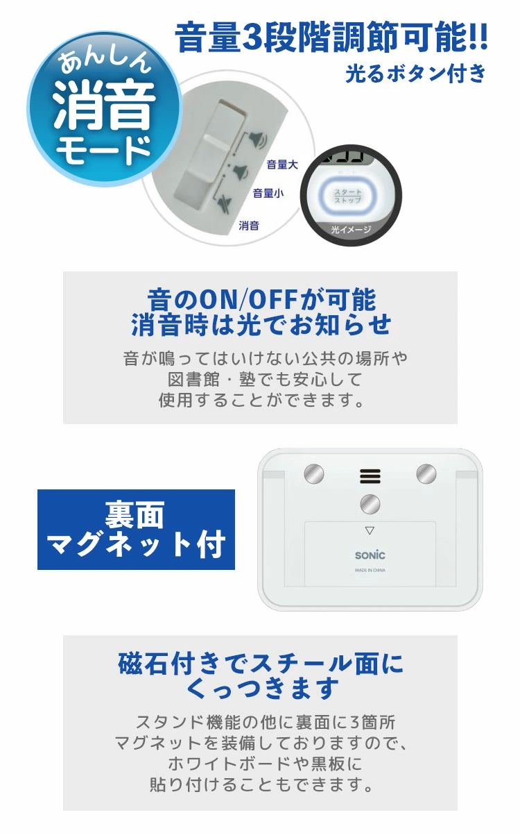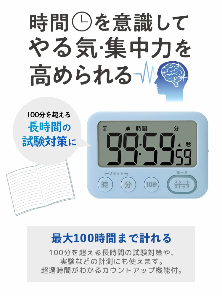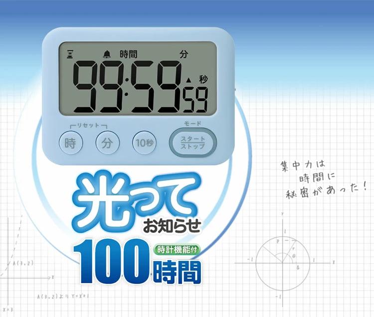 ★最大100時間まで時間が計れるので、長時間の試験対策や実験などの計測にも使えます。★音のon/off設定が可能で、タイムアップを光でお知らせします。★見やすい角度で自立するスタンドつき。裏面には磁石付きでスチール面に貼りつきます。★【めざせ!集中力up!】タイマー式学習法はやわかりガイドブックつき。★時計機能・アラーム機能付。タイムアップ後は、自動でカウントアップに切り替わるので超過時間がわかります。【アラーム】電子音⇔ledライトの切り替え式/アラーム鳴動時間 約60秒【設定時間】カウントダウン時:最大99時間59分50秒 最小10秒/カウントアップ時:最大99時間59分59秒【音量】小:約65db 大:75db(2段階調整が可能)お試し用電池付き(単4乾電池×2本)