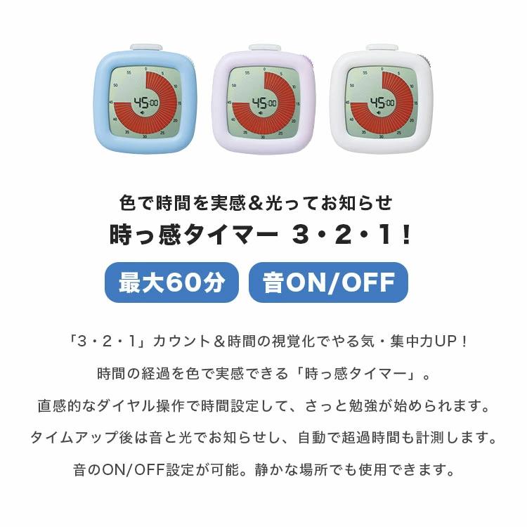 【時っ感タイマー 3・2・1!】「3・2・1」カウント&時間の視覚化でやる気・集中力UP!時間の経過を色で実感できる「時っ感タイマー」。直感的なダイヤル操作で時間設定して、さっと勉強が始められます。タイムアップ後は音と光でお知らせし、自動で超過時間も計測します。音のON/OFF設定が可能。静かな場所でも使用できます。
