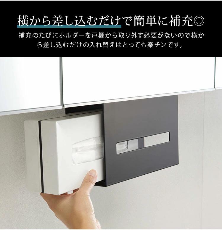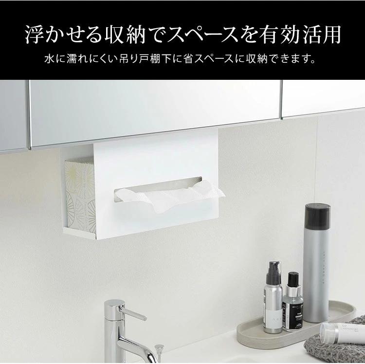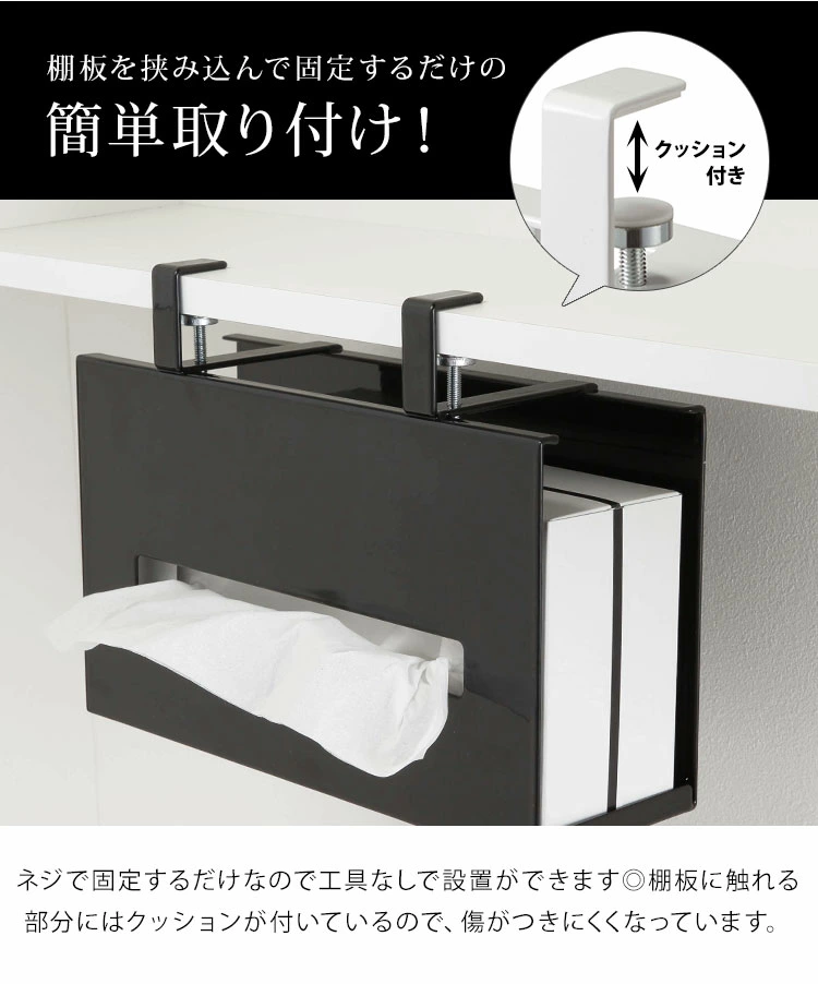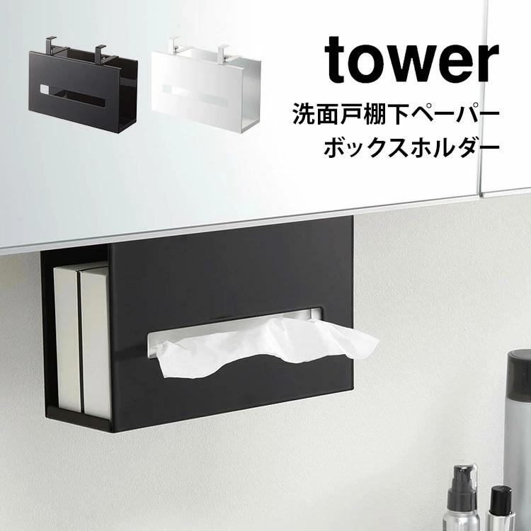 【洗面戸棚下ペーパーボックスホルダー】洗面所の吊り戸棚に浮かせて収納できる、towerの洗面戸棚下ペーパーボックスホルダー。浮かせて収納すれば水に濡れる心配も少なくて済みます◎棚板に挟み込んで使用するので、棚板に穴を開ける必要もなく賃貸の方にもオススメです。