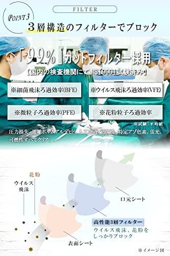 【サイズ】(約)14.0cm×11.0cm (折りたたみ時)【個包装仕様】1枚1枚包装を行っている為、衛生的で30枚入りなので持ち運びや家族・お友達にプレゼントするにも便利♪【医療用クラスⅢ品質】JIST9001医療用マスククラスⅢクリア!フィルター性能99%カットに加え、医療用として必要な機能性も最高クラスをクリアしております。【安心安全の日本製】福岡にある工場で徹底した品質管理の基に製造を行っております。 さらに、衛生面に配慮した環境下にて目視で検品を行い、安心安全の日本製マスクをお客様に提供しております。【3D設計】3Dデザインによって、立体でくちもとの空間を広く、息がしやすく快適な状態で美しいフェイスラインを実現した3Dマスク。【耳が痛くなりにくい】幅6mmで柔らかく伸縮性抜群な耳紐を使用し、長時間の着用でも耳が痛くなりにくい。