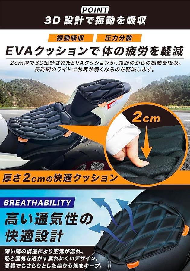 (1) 長距離が変わる、快適な3Dクッション設計 立体構造が路面の振動を吸収し、お尻や腰への負担を軽減。