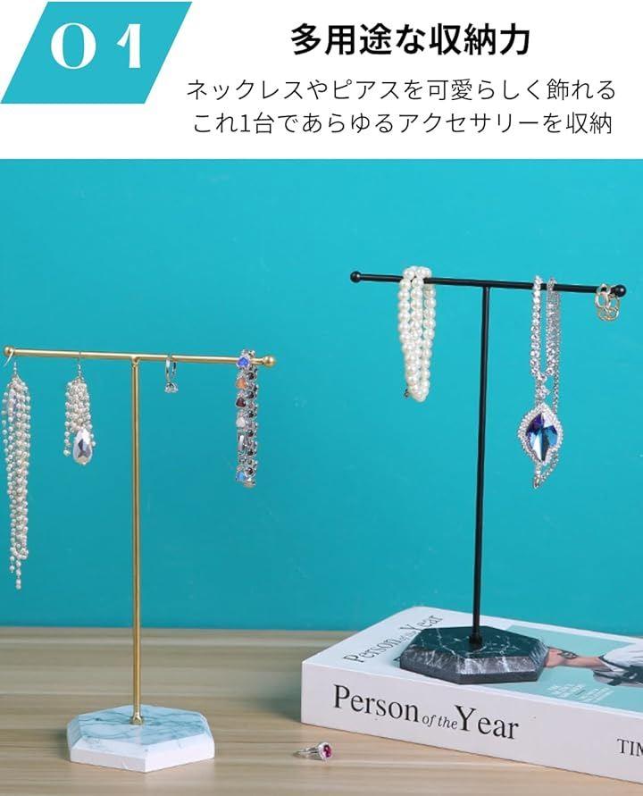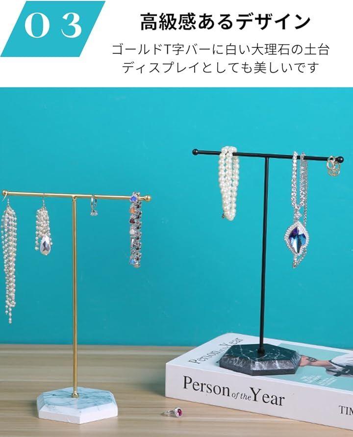 「多用途な収納力」アクセサリーの収納に困っていませんか?「ピアスはバラバラにしておくと片方無くなる」「ネックレスはそのままにしておくと絡まってしまう」なんて悩みとはおさらば。T字バーにネックレスやピアス、ブレスレットをかけることができ、1台であらゆるアクセサリーをまとめてディスプレイ&収納可能に。