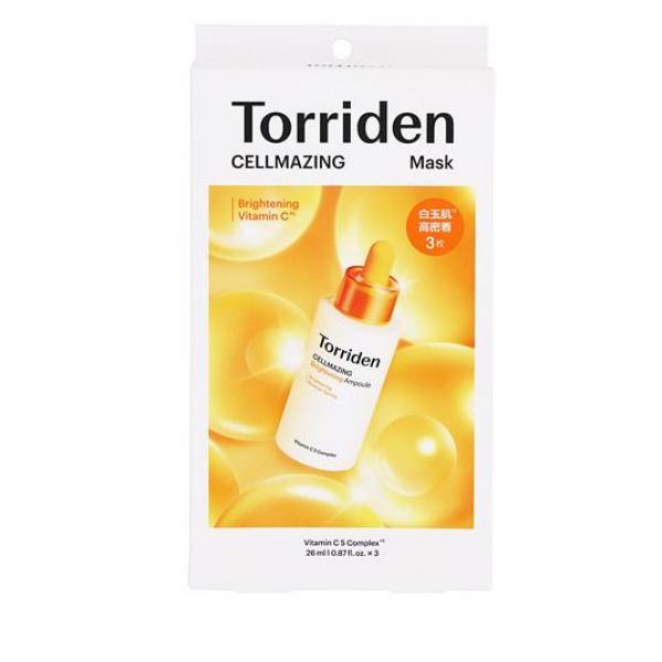 製品の特徴●トリデン セルメイジング ビタC ブライトニングマスク(Torriden CELLMAZING Brightening Vitamin C Mask)●ヴィーガンシートが肌に密着!使うほどしっとりうるつや肌へ!●「純粋ビタミンC+ビタミンC誘導体をリポソーム化」サイズの異なる5種類のビタミンCを配合。リポソーム化することで成分の安定性が高まり、新鮮なまま、肌の角質層まで届けます。●「マスク1枚で内側からツヤ・輝きのある白玉肌に」ブライトニングケアから水分ケア、肌荒れ防止ケアまで効果が期待できる成分をたっぷりと詰め込みました。●「べたつきのない使用感と肌あたりのやさしい高密着シート」3種類のマイクロファイバー繊維で作られたヴィーガン認定シートが肌にやさしく密着。エッセンスをたっぷり含んだシートで美容成分をお肌へ届けます。剝がした後も、べたつかずにエッセンスが肌にスッと馴染み、水光うるツヤ肌へ。●「注目の美容成分のグルタチオン、ナイアシンアミド配合」抗酸化作用、ニキビ、赤ら顔、毛穴の開きに効果的な話題の成分グルタチオンや、ブライトニング、肌荒れケアだけではなく、メラニンの生成を抑えてシミ・そばかすを防ぐ効果があるナイアシンアミドを配合。5D-リポソームビタミンと合わせて肌の色ムラ悩みが気にならないキメの整った透明感溢れる肌へと導きます。●販売名:トリデンCVBマスク〈フェイスマスク〉