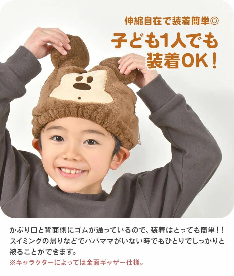 かぶるだけでキャラクターに変身!お風呂上がりやスイミング、海水浴などのシーンで便利なキッズタオルキャップ。しっかり吸収してくれる優しい肌触りのマイクロファイバー生地を使用。伸縮自在で子ども1人でも装着できます◎小学校高学年の子でも使えるので長い期間使用可能です♪