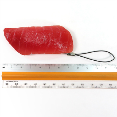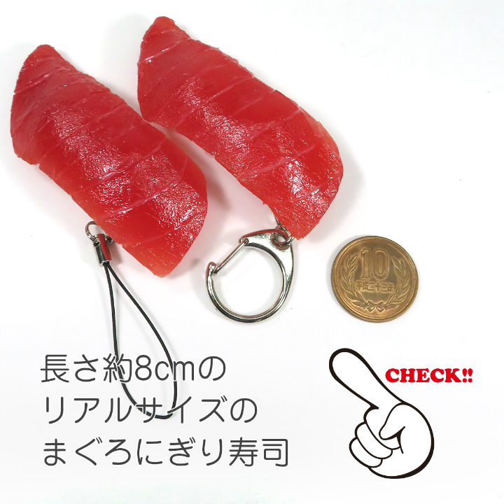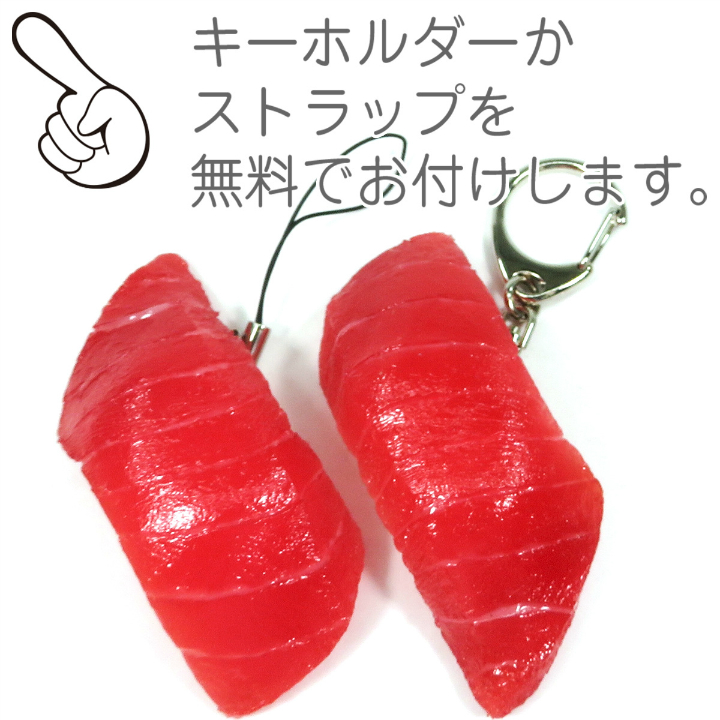 本物のまぐろにぎり寿司そっくりに作られた食品サンプルのアクセサリーです。スジは線を引いただけではなく、ちゃんとスジのパーツが中に入っています。こだわりの製法でここまでリアルになりました。