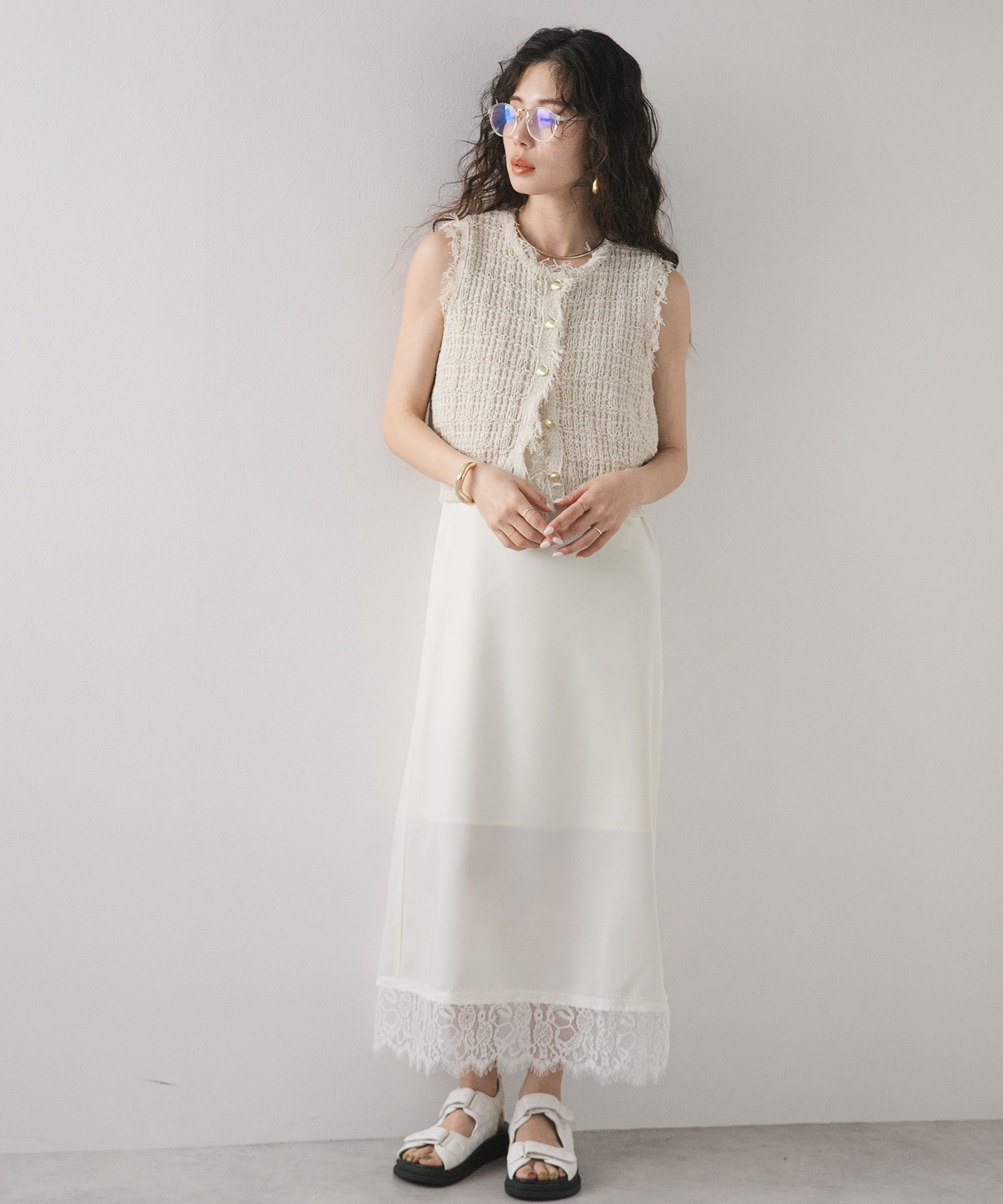 シアートップスやカットソー、ブラウスと合わせることで華やかさをプラス。