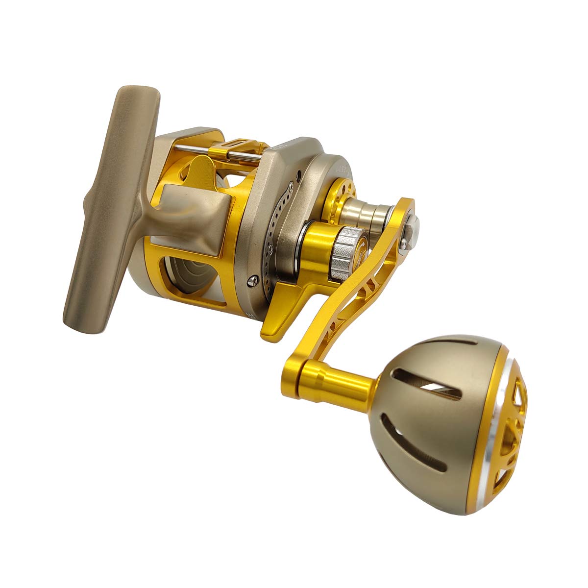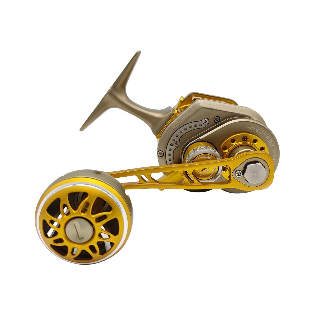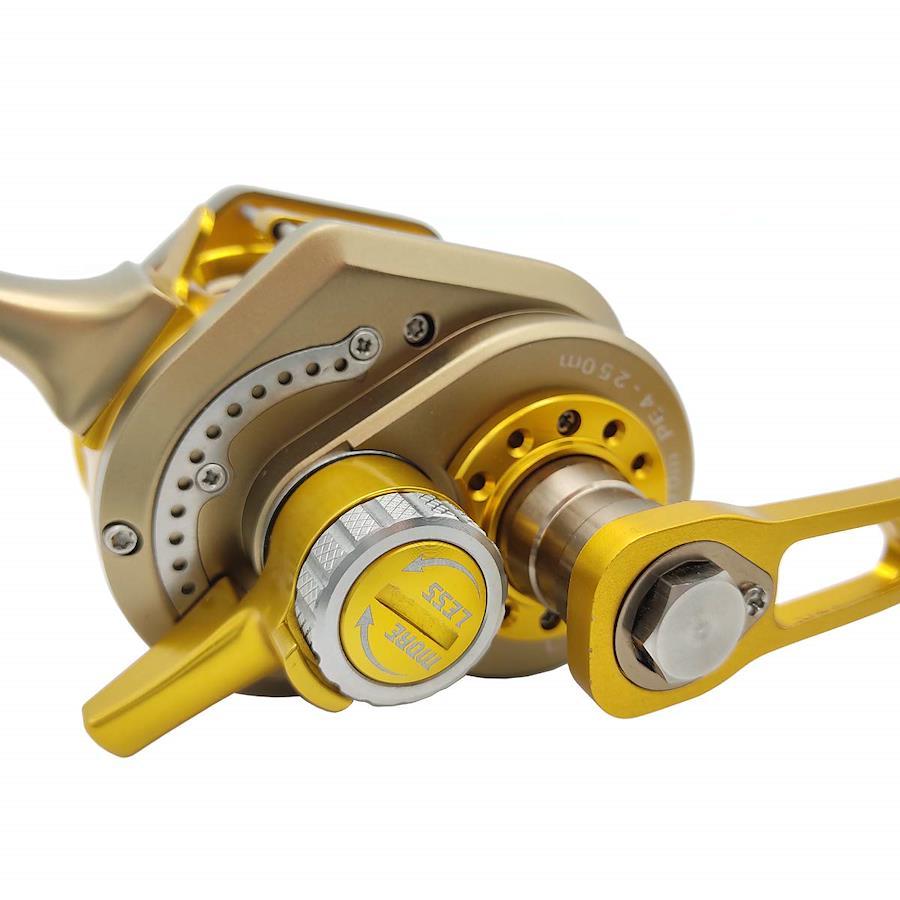 究極のタックルを目指すアルテマより、スピニングロッドでもベイトロッドでも使える万能リール「XENOリール」が登場です。基本構造か?ヘ?イトリールになっているため、スヒ?ニンク?リールの大きなテ?メリットて?もある糸よれを起こすことがなく、著しい劣化を防ぐことができます。スヒ?ニンク?リールは、ハント?ルの縦方向の回転をローターの横方向の回転に変換する際にハ?ワーロスが生じますが、「XENOリール」はハント?ルの回転方向とスフ?ールの回転方向か?同し?なため、ハ?ワーロスを少なくすることができます。ハント?ル1回転あたりの巻き上げ長さか?同し?場合は、スヒ?ニンク?リールより軽い力て?力強くラインを巻き上け?ることができるので、それも魅力のひとつです。(左ハンドル)仕様:【自重】512g|【ギア比】6.3:1|【最大ドラグ力】30.5kg|【糸巻量(PE)】PE3号(0.296mm)300m、4号(0.342)225m、5号(0.382mm)180m ※糸巻量は参考値となります。種類やメーカーによって多少の誤差がございます。|【最大巻上長(cm/ハント?ル1回転)】89cm<注意>こちらのリールはベイトリールの為、流れがかなり早い場所や重いルアーやオモリなどのフォール、着底の時やキャスティング時にサミングをしない場合は、バックラッシュする可能性が高くなります。したがってベイトリールのバックラッシュの原因やバックラッシュした際の対処法など詳しくない方には向かないリールとなりますので、予めご承知おきくださいますようお願いいたします。商品画像はトップ画像以外、右ハンドル仕様の画像です。