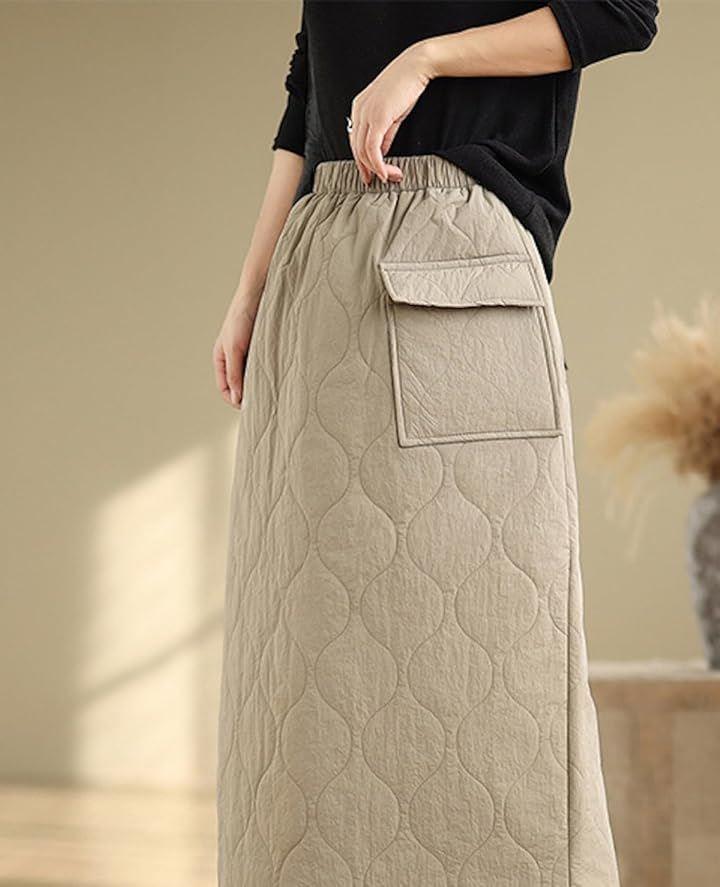 落ち着いた雰囲気は合わせるアイテムを選ばずコーディネートしやすく、また後方にはスリットが入っていますので動きやすいスカートとなっています。