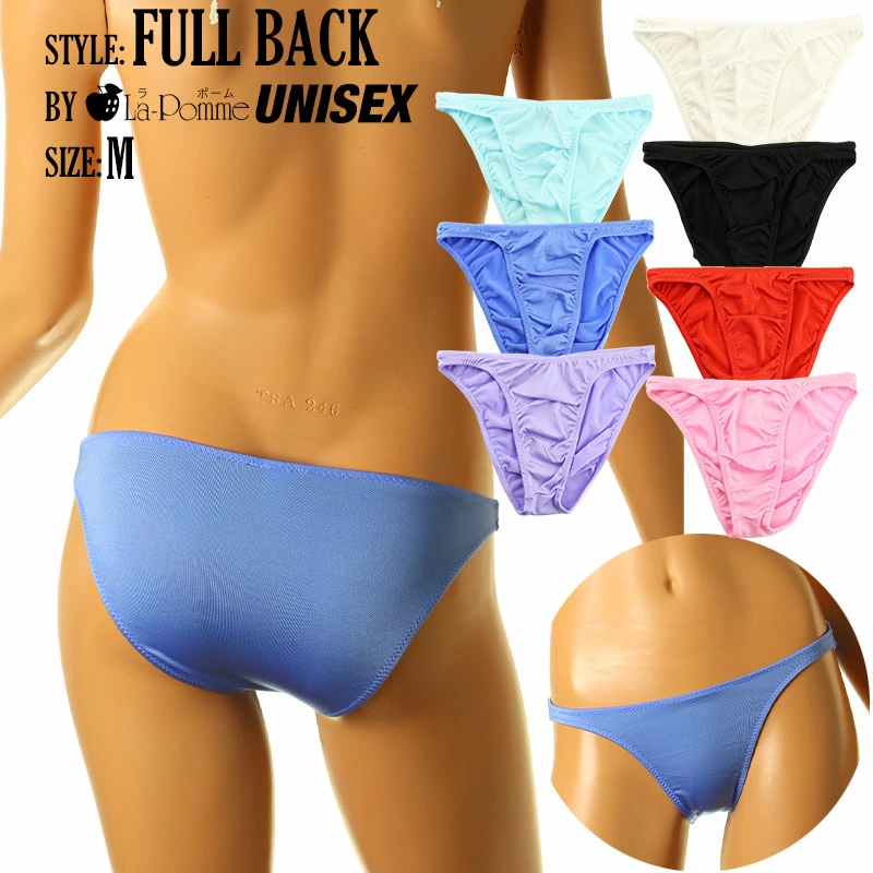 微かなキラキラとした光沢が煌めく中、心地よいサラサラ感が広がり、柔らかな肌触りとストレッチ性を兼ね備えたTSK生地を使用したフルバックショーツになります。ハイレグ気味のパターンになった普段使いにも最適なユニセックスビキニになります。