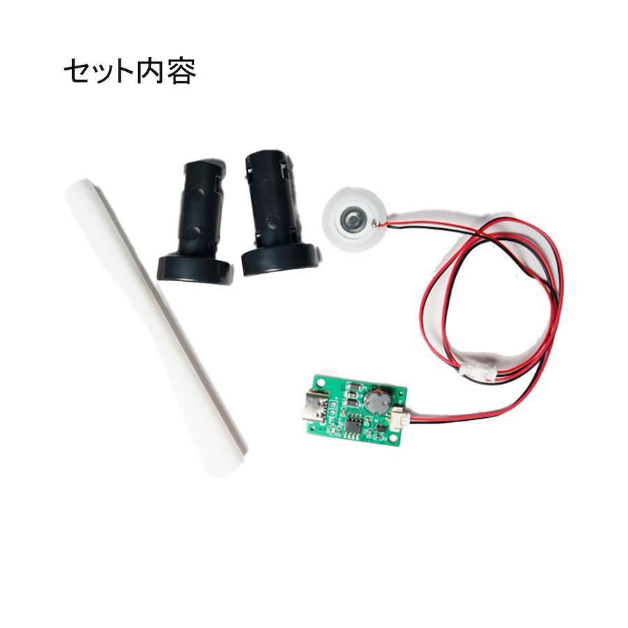 基本仕様制御基板外寸:W19×H69×D30mm重量:約40g発生機 超音波トランスデューサ:W16mm 厚さ0.7mm(円形)給水芯カバー:W24×H38(円形組立式)駆動周波数:約108kHzパワー:1.5〜2Wリード線長:約300mm(中継線込み)給電:5V USB Type-C