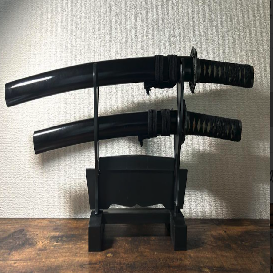 This is a Used set of two Japanese Katana Sword Replicas (Daisho), including one long sword and one short sword, along with a plastic display stand. 🇯🇵 These are Ornamental Metal Replicas intended primarily for display and decor.